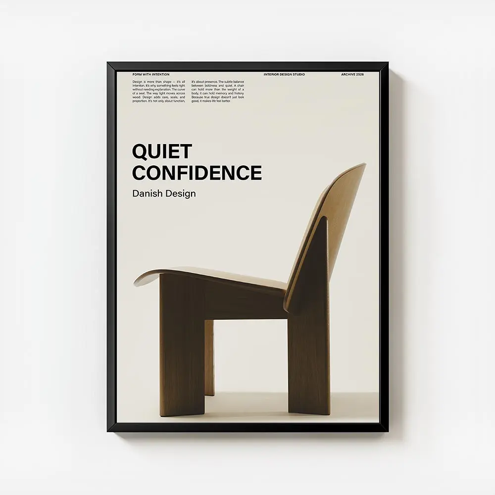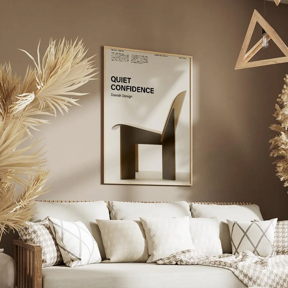 Cette Affiche texte quiet confidence et chaise danoise joue la simplicité. Le fond reste clair, presque blanc cassé, et met en valeur le texte noir, grand et lisible: "quiet confidence". À côté, une chaise danoise en bois clair occupe le coin droit, avec un dossier arrondi et des pieds fins. L'ensemble respire le calme, très minimal, très net.