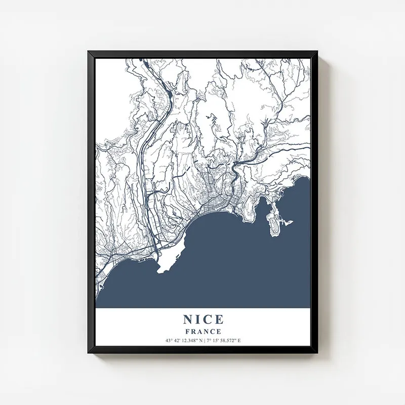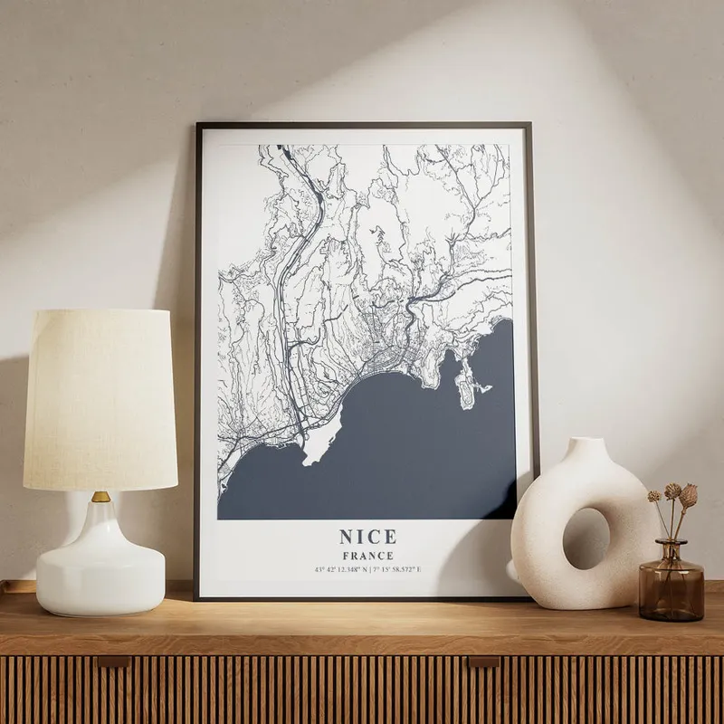 On est vraiment sous le charme de l'Affiche carte Nice. En la voyant, on ressent tout de suite une ambiance ensoleillée et pleine de vie. On dirait que cette affiche nous transporte directement sur la Côte d'Azur, avec son ciel bleu éclatant et ses paysages qui font rêver. C'est comme si on pouvait presque entendre les vagues et sentir la brise marine, vous voyez ce que je veux dire ?
