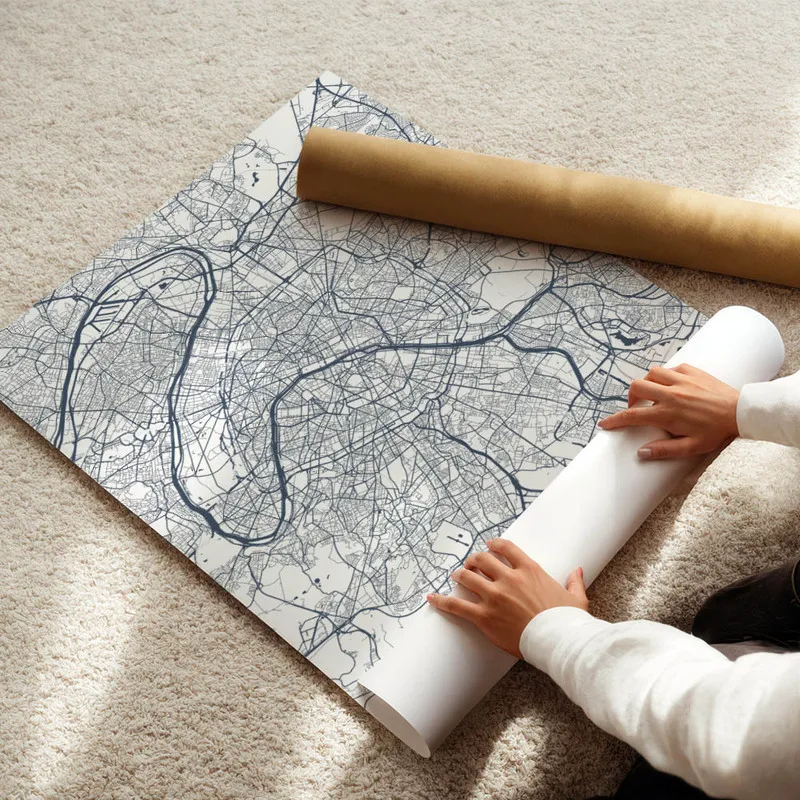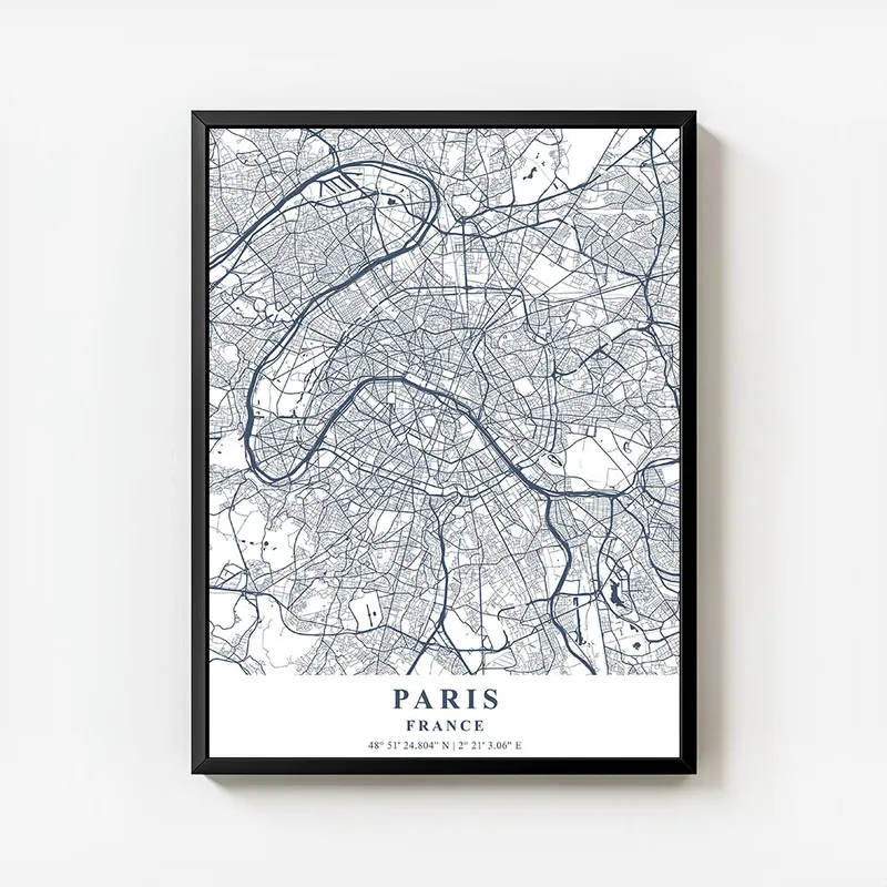 Ce qui nous frappe, c'est la finesse des détails sur la carte. On adore ce contraste entre le noir et le fond clair, ça donne un petit côté chic à l'ensemble. On peut presque sentir l'odeur des croissants chauds et entendre la musique des artistes de rue en l'observant. Cette affiche a ce je-ne-sais-quoi qui change tout dans une pièce.