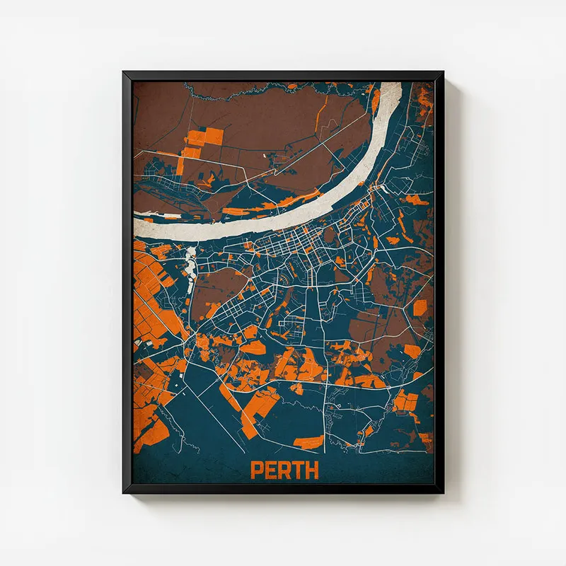 Ce qui est vraiment chouette, c'est le détail de la carte. On y voit des lieux emblématiques, des chemins, tout comme si on feuilletait un vieux carnet de voyage. Ça fait rêver, n'est-ce pas ? On se projette à Perth, à flâner le long des plages, ou à explorer les petits coins cachés de la ville. C'est l'affiche parfaite pour amener un peu de chaleur et d'histoire dans un salon ou un bureau.