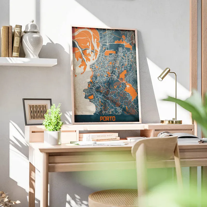On est vraiment fans de l'Affiche carte Porto vintage. En la découvrant, on ressent tout de suite une douce nostalgie, comme si elle nous transportait directement dans cette belle ville portugaise. Les couleurs chaudes, ce jaune et ce bleu, ça fait penser aux maisons du bord de mer et aux ruelles pavées. On a presque envie de prendre un verre de porto sur une terrasse, en admirant la vue !