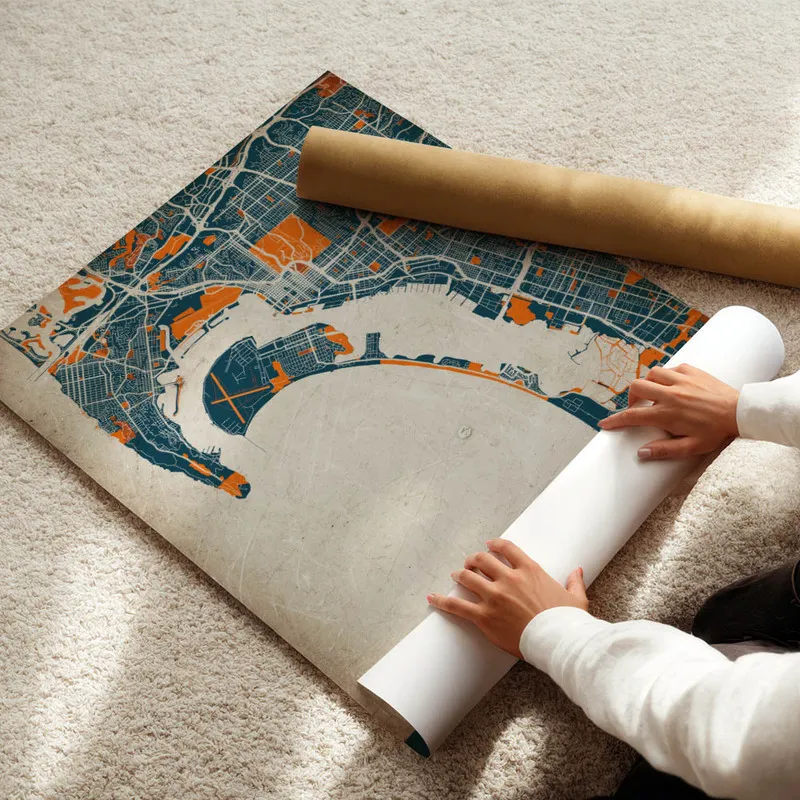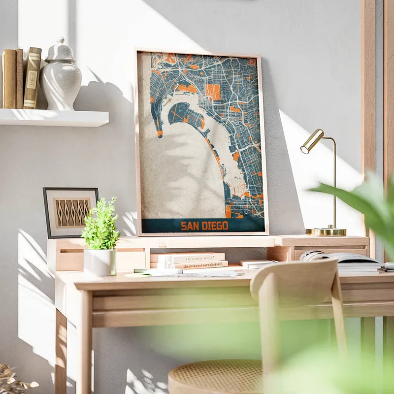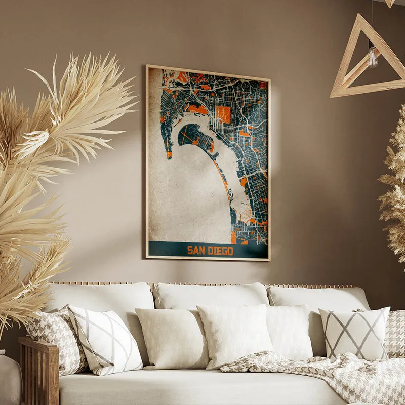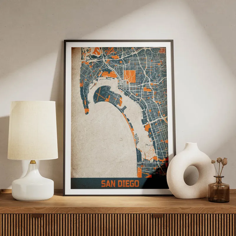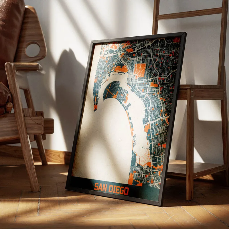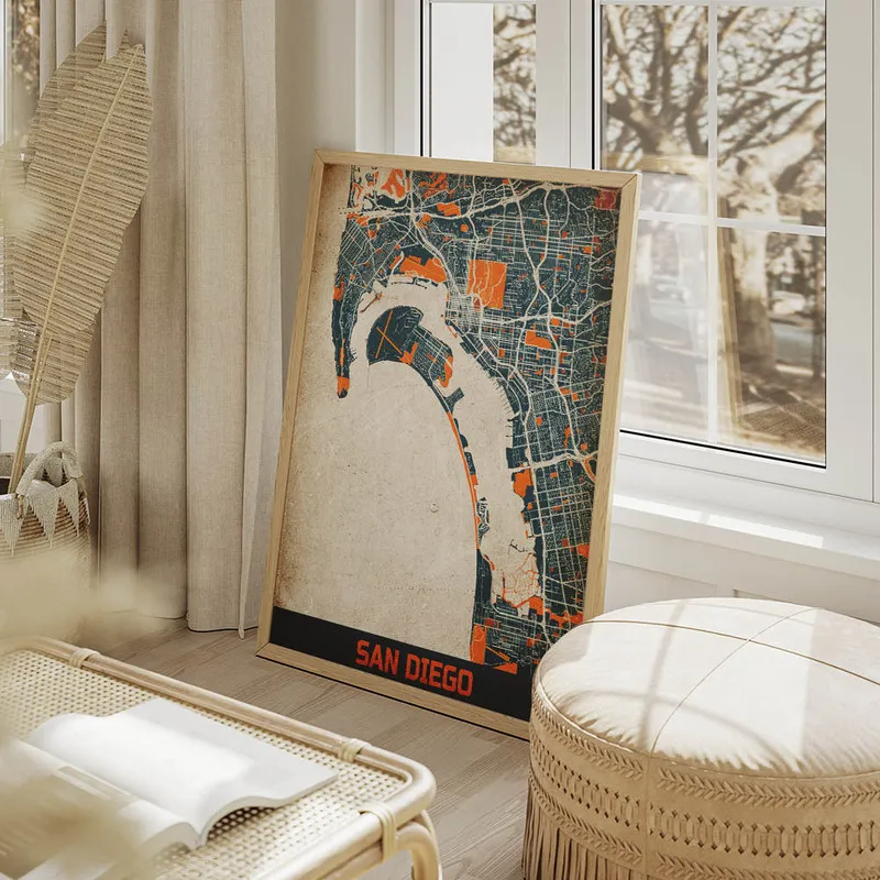 Cette Affiche carte San Diego vintage pourrait vraiment donner une ambiance chaleureuse à un salon ou une chambre. C'est génial de l'imaginer accrochée au-dessus d'un fauteuil confortable, idéal pour se plonger dans un bon livre. En plus, elle s'accorderait parfaitement avec d'autres affiches sur les paysages marins ou même des affiches vintage. N'hésitez pas à jeter un œil aux posters de plages ou aux posters de paysages pour compléter votre déco. Ça créerait un coin vraiment harmonieux.
