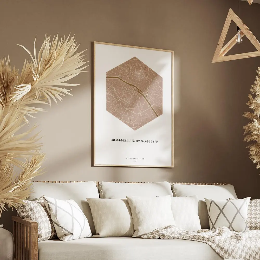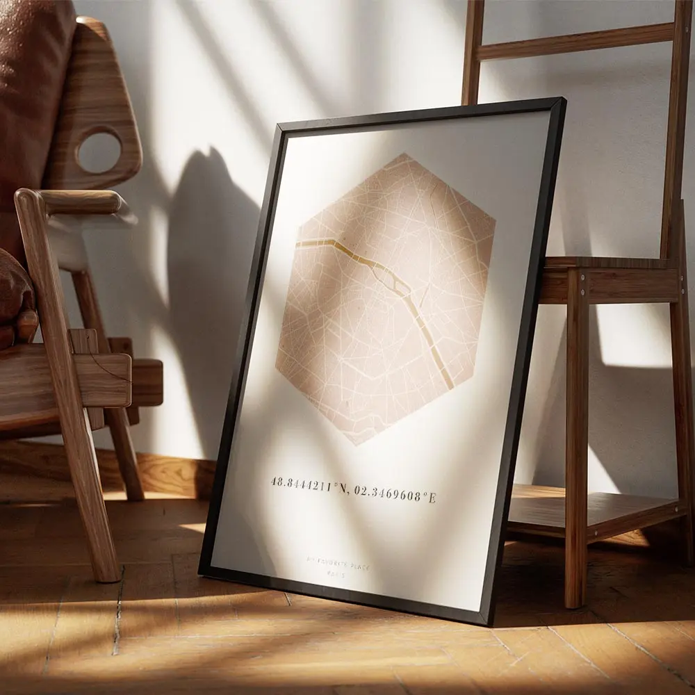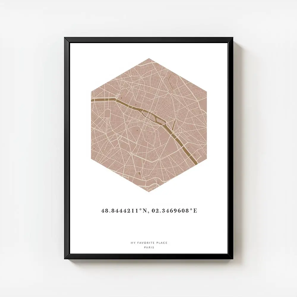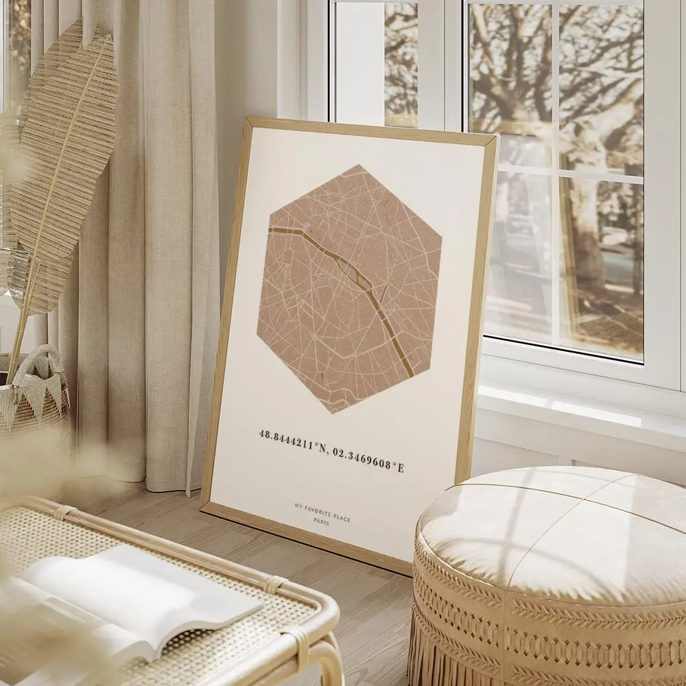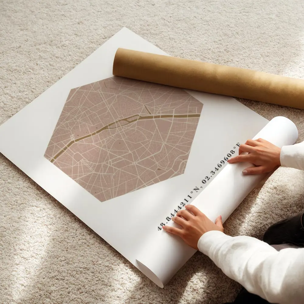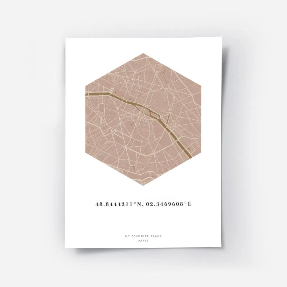 Ce Affiche carte ville hexagone rose montre une carte de ville coupée en hexagone. On voit deux tons principaux: un rose doux et un moutarde chaud. Le tracé des rues apparaît en lignes fines, précises, presque géométriques. On distingue des zones en aplat, des intersections marquées et un contour net qui fait bien ressortir la forme.