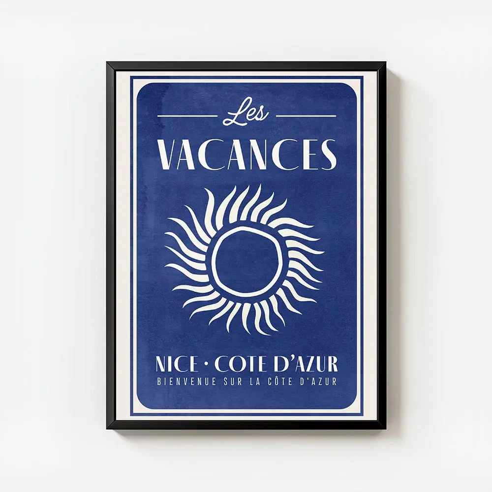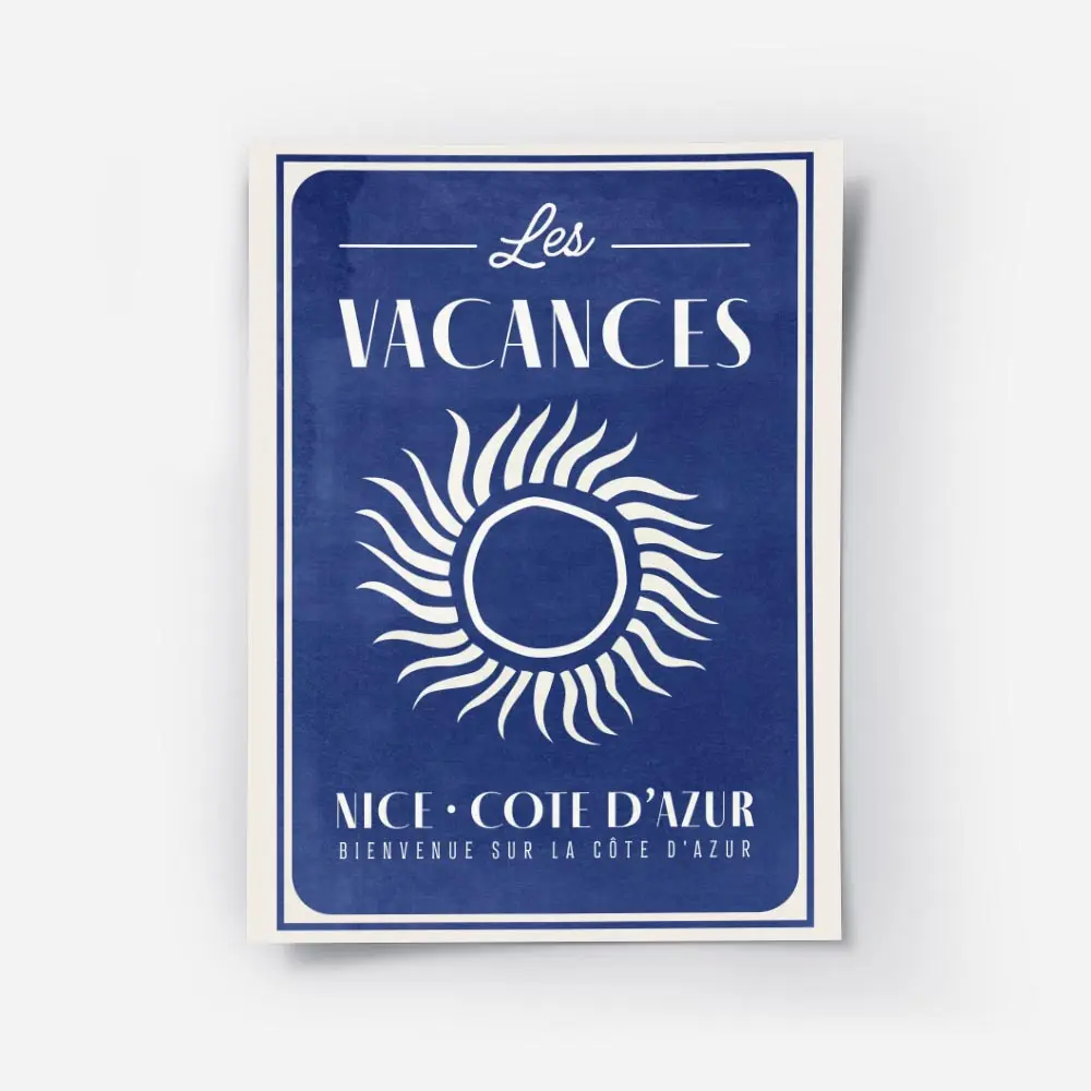 Ce Affiche Nice Côte d’Azur bleu foncé attire le regard avec un contraste fort et immédiat. On voit un grand fond bleu profond, un soleil blanc éclatant en forme de disque, et du texte qui annonce la destination. L’ensemble reste très graphique, simple et lumineux. On ressent tout de suite l’idée du voyage, la chaleur, l’air marin, même si l’image reste épurée. Un rendu qui saute aux yeux, vraiment net, agréable.