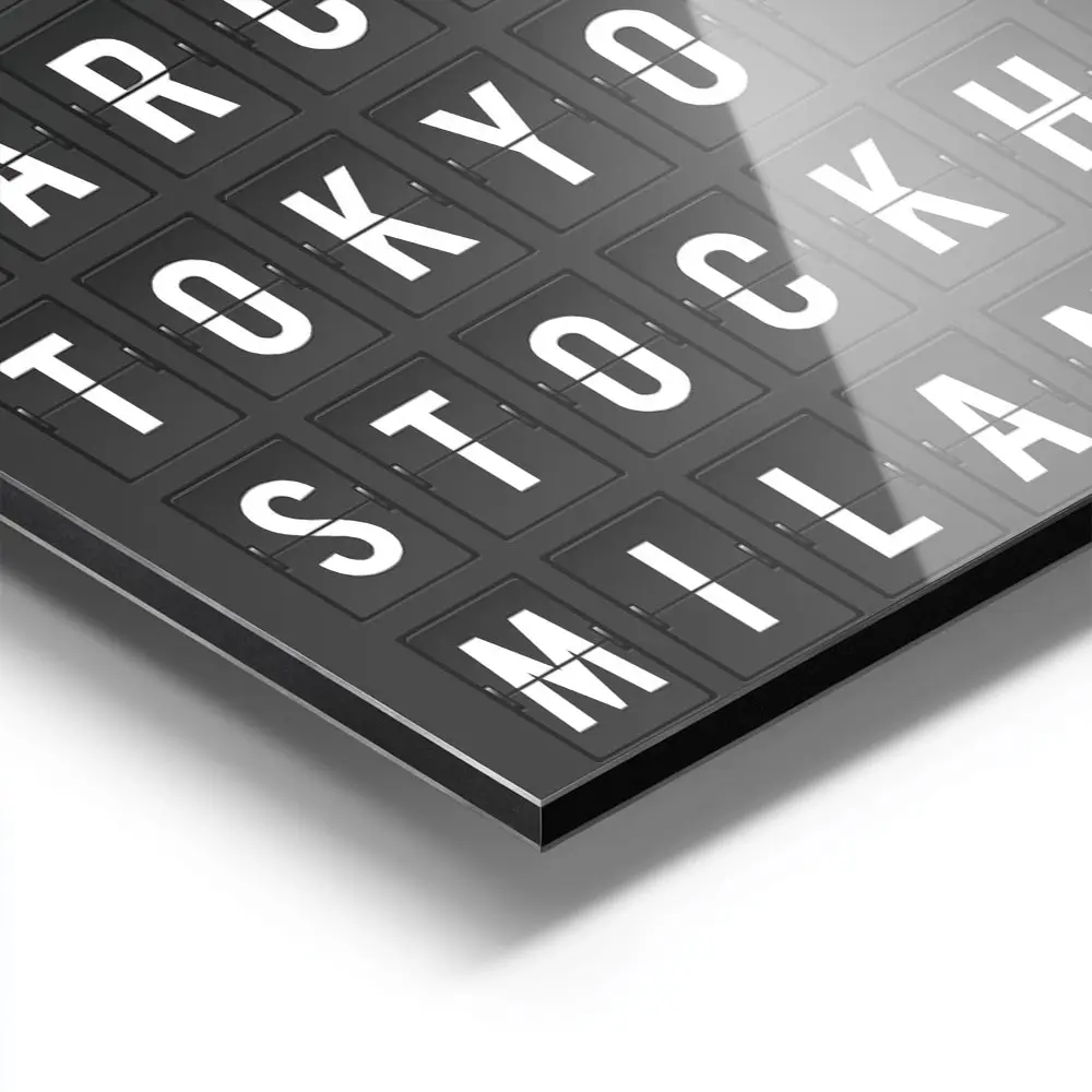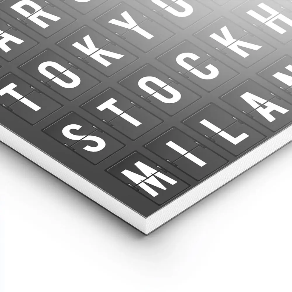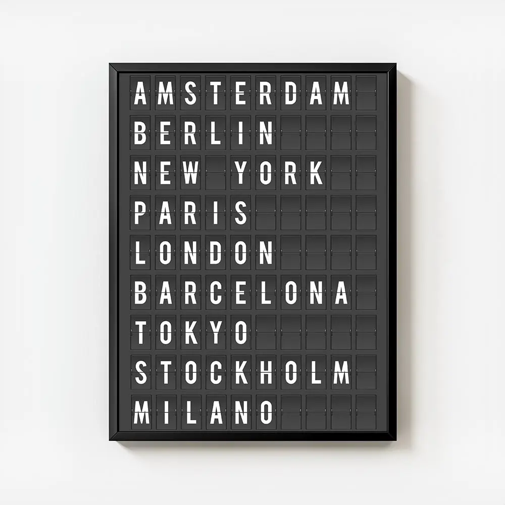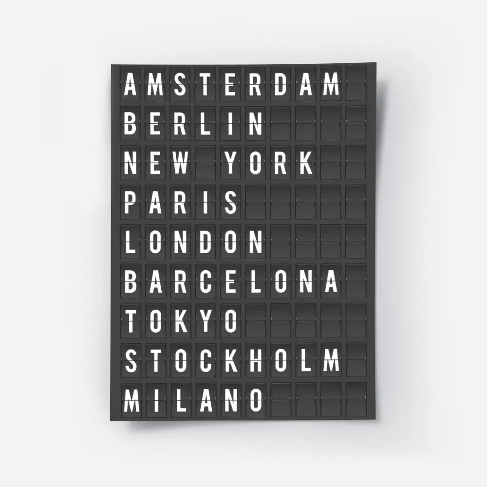 Au premier plan, des lignes de texte blanches qui tranchent fortement avec le noir du fond. Les noms de villes occupent toute la surface verticale, la composition reste centrée et ordonnée. Le contraste fort et la simplicité de la mise en page donnent une impression sobre et contemporaine.