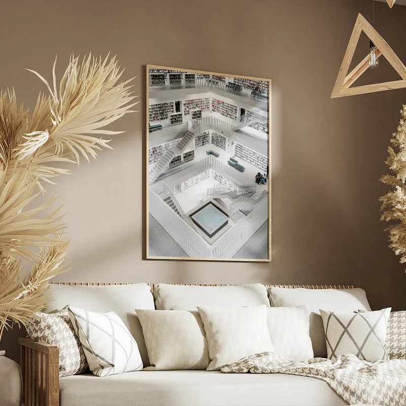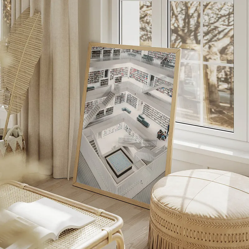 On imagine parfaitement ce Poster bibliothèque moderne Stuttgart dans un coin lecture, ou même dans le salon. C'est l'idéal pour créer un espace cosy et inspirant. Pour compléter ce style, pourquoi ne pas explorer d'autres affiches d'architecture ou encore ajouter une touche de nature avec des posters de plantes ? Ça apporterait une belle ambiance intérieure.