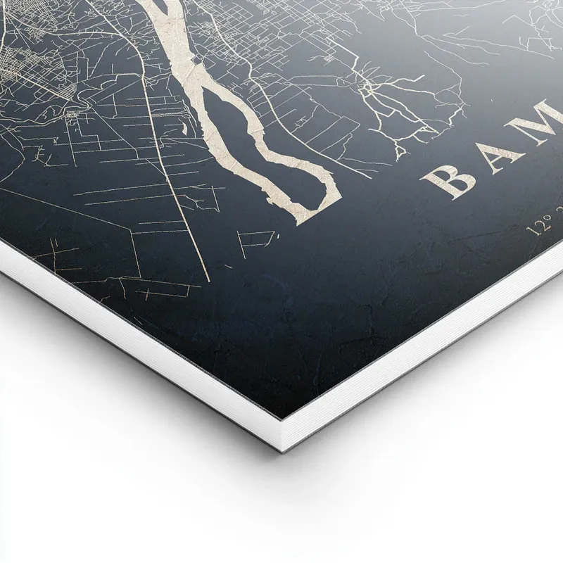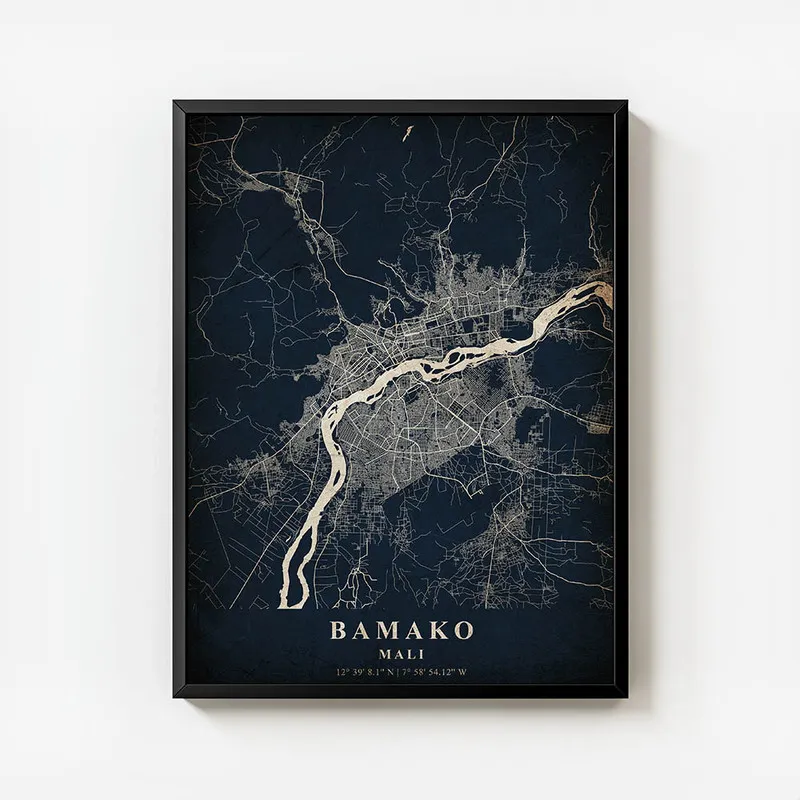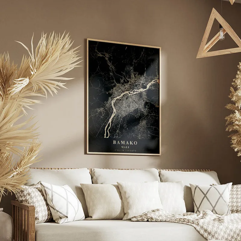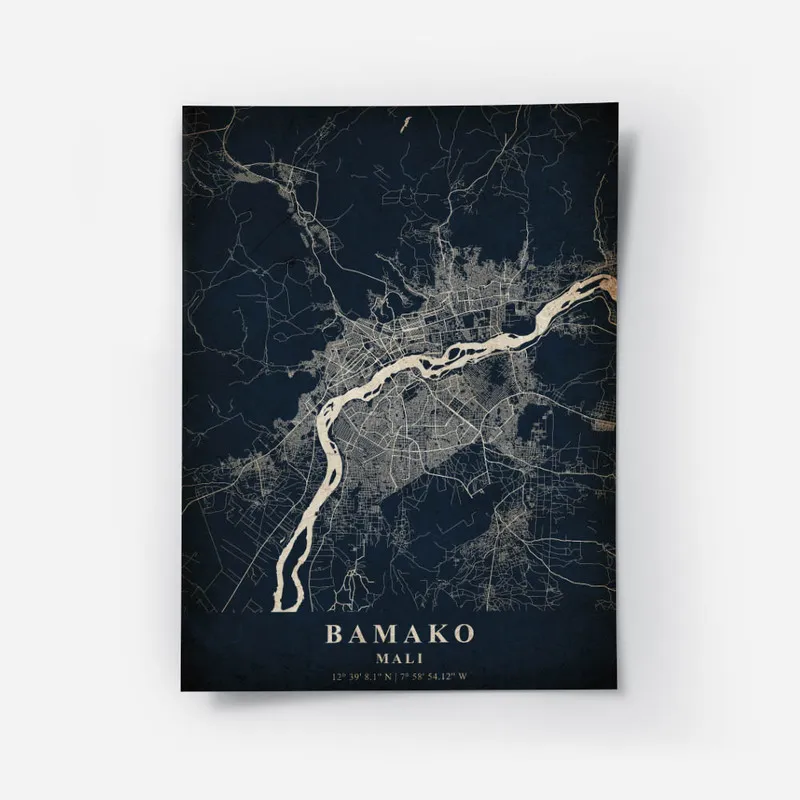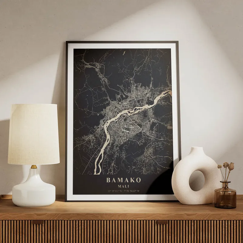 Ce qui nous frappe, c'est les teintes chaudes, presque dorées, qui donnent vie à cette carte. On a envie de l'afficher dans un salon ou dans un bureau pour se rappeler que le monde est vaste et plein de surprises. C'est un peu comme une fenêtre ouverte sur la culture et l'histoire de Bamako, et ça, ça nous parle vraiment. On peut presque imaginer les rires, les odeurs d'épices et les couleurs vibrantes de cette ville.