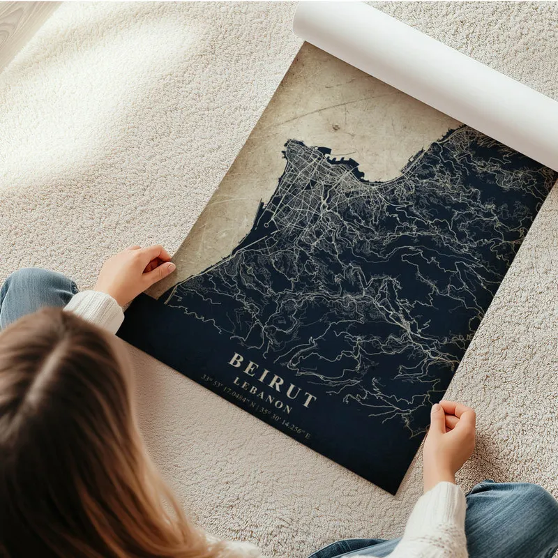 Ce qui nous frappe, c'est la délicatesse des détails sur la carte. Chaque rue, chaque coin, ça raconte une histoire. On s'imagine déjà en train de déambuler dans les rues de Beyrouth, avec le doux bruit de la ville en fond. C'est une belle manière d'ouvrir une fenêtre sur cette culture riche et vibrante. On aurait presque envie de prendre un café sur une terrasse, juste en face de ce poster.