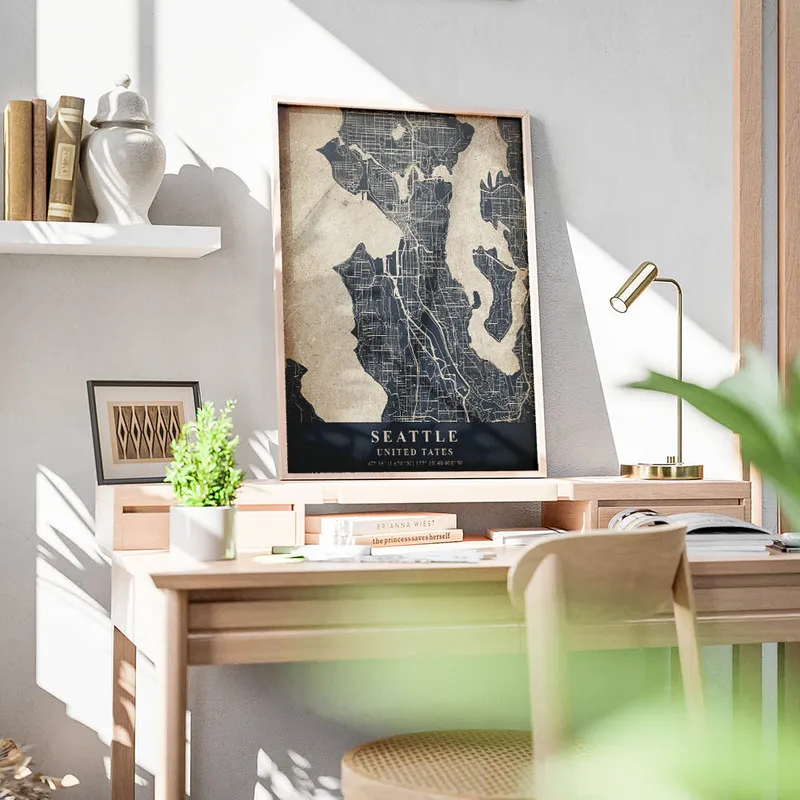 On pense aussi à associer ce Poster carte Seattle vintage avec d'autres affiches d'architecture ou des cartes vintage. Ça peut vraiment créer un coin déco sympa et cosy. Pourquoi ne pas jeter un œil à nos illustrations graphiques pour compléter le tout ? En tout cas, ce poster, c'est un vrai petit bijou qui a sa place chez nous, pour rêver et voyager sans bouger de chez soi.
