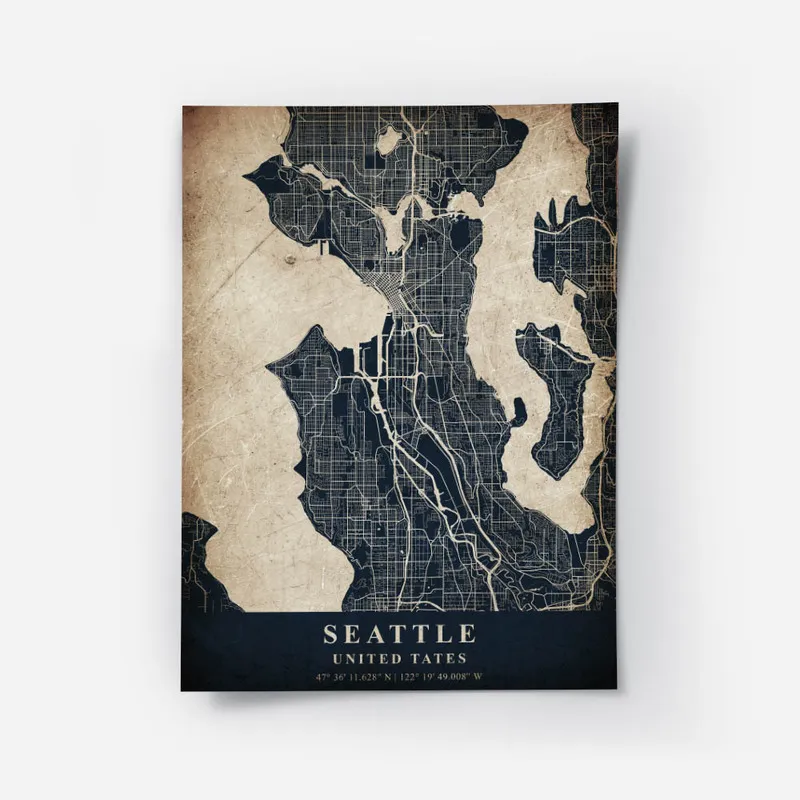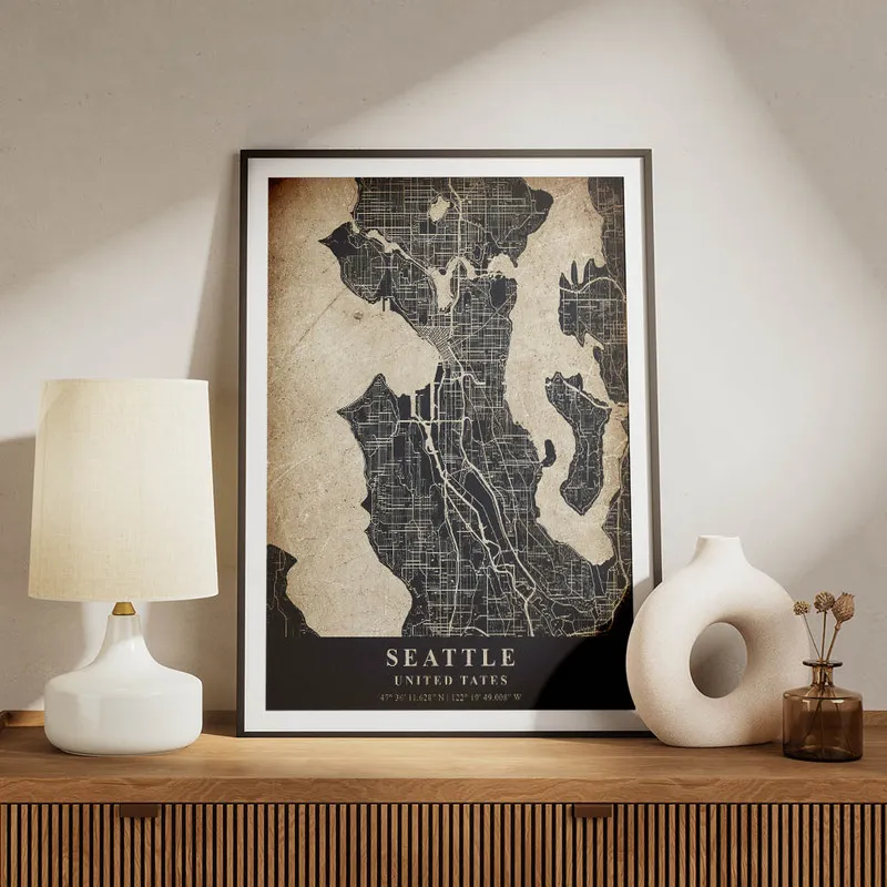 On est vraiment sous le charme du Poster carte Seattle vintage. Quand on le regarde, on a l'impression de faire un voyage dans le temps. Cette carte, avec ses teintes chaudes, évoque des souvenirs de l'époque où Seattle était en plein essor. Ce qu'on aime, c'est cette ambiance rétro qui s'en dégage, presque comme une invitation à explorer la ville autrement. Quand on la voit, on pense à des balades le long du waterfront et à la découverte de petits cafés cachés.
