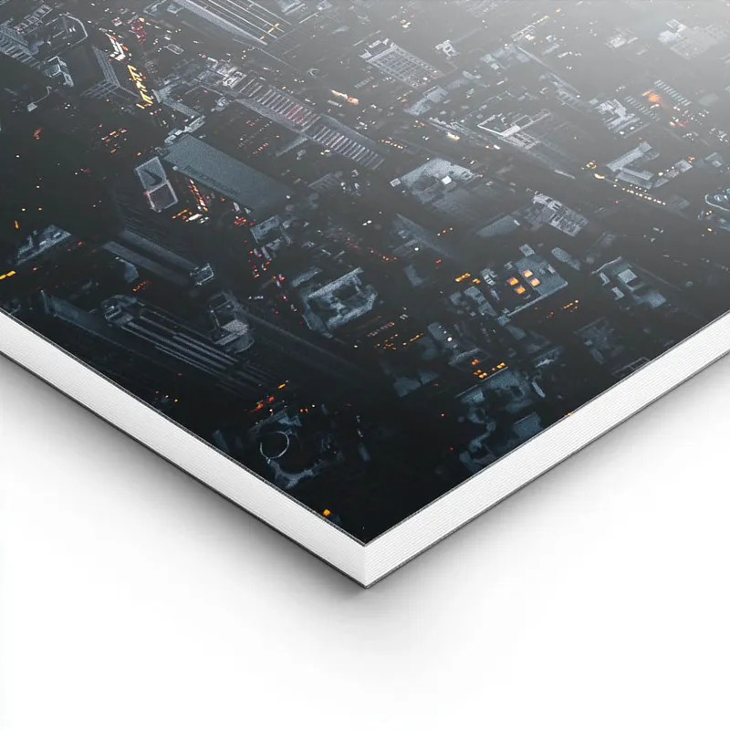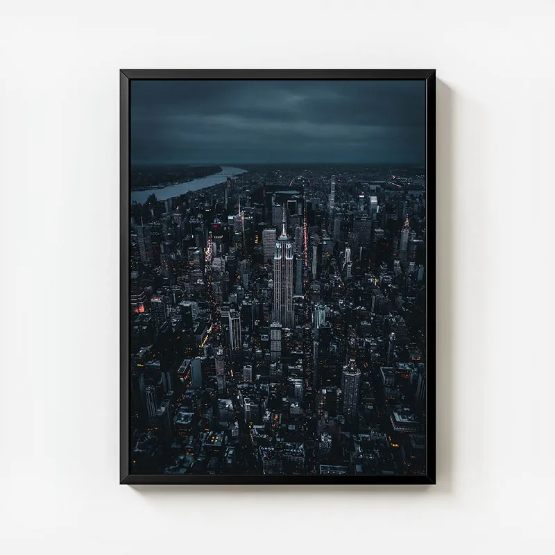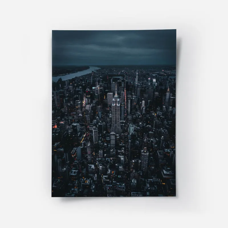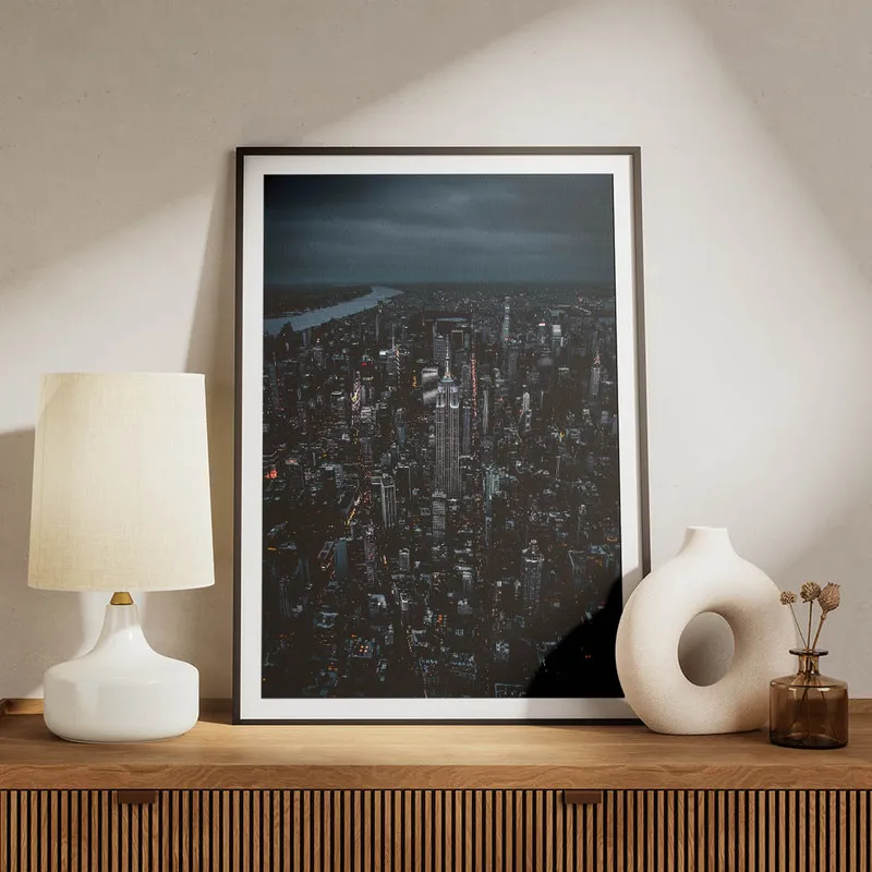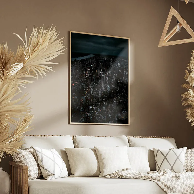 Ce qu'on adore, c'est la façon dont les tons sombres se mêlent aux éclats de lumière. Il y a quelque chose de poétique là-dedans, on dirait une peinture qui raconte une histoire - celle d'une ville qui ne dort jamais. Ce Poster skyline de nuit va apporter une belle touche de sophistication à votre salon ou pourquoi pas dans un bureau ? Ça crée une ambiance tellement douce et inspirante.