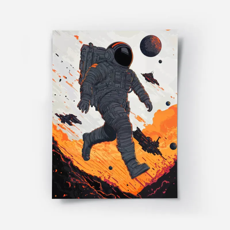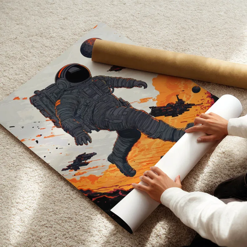 Ce qu'on aime, c'est ce mélange de couleurs éclatantes qui mettent de la bonne humeur dans une pièce. Les bleus profonds, les touches de rose, ça évoque les galaxies lointaines et les mystères de l'univers. On dirait presque que cet astronaute nous invite à rejoindre son voyage. On se voit très bien lui donner une belle place dans une chambre d'enfant ou même dans un bureau. C'est le genre de poster qui peut inspirer la créativité.