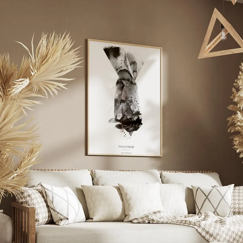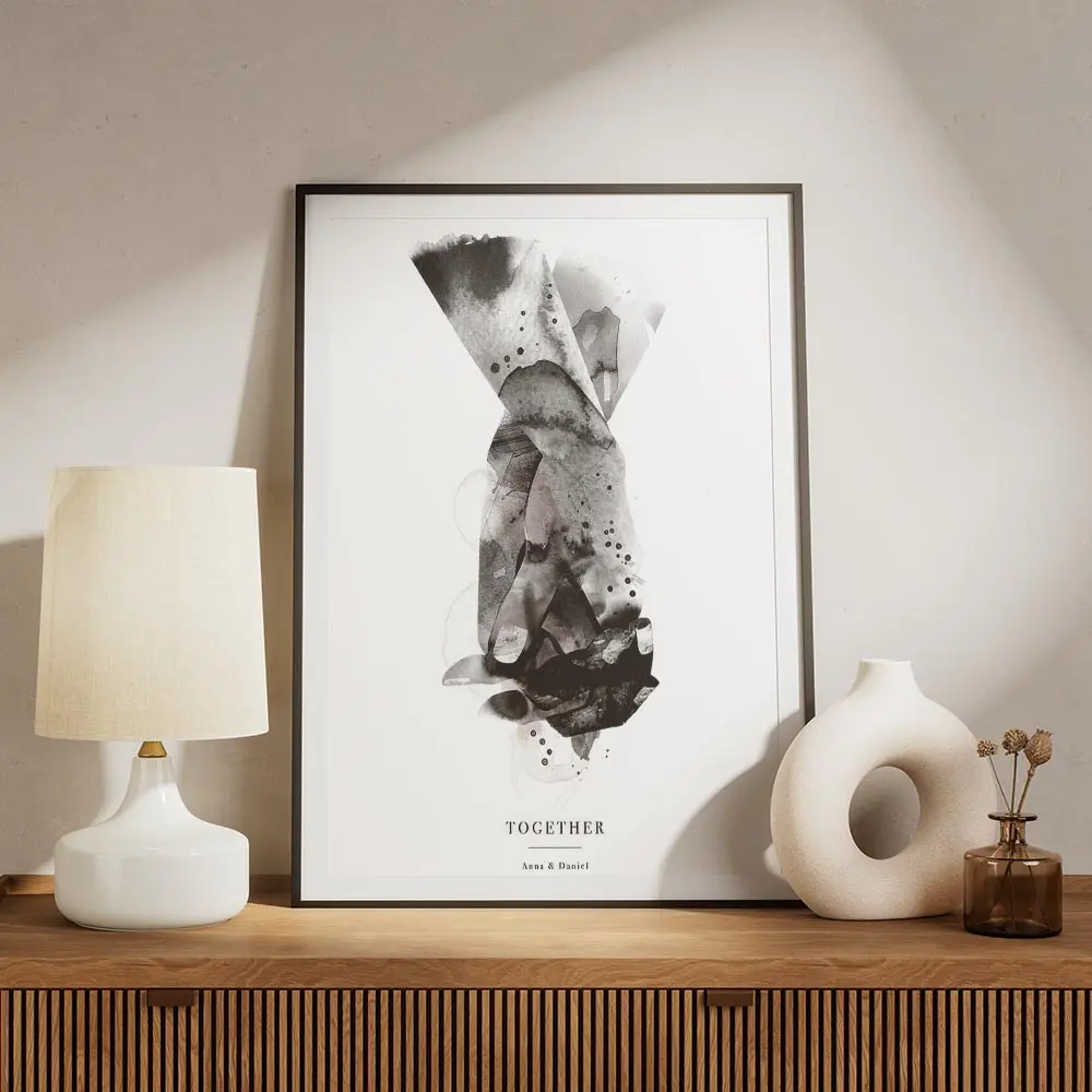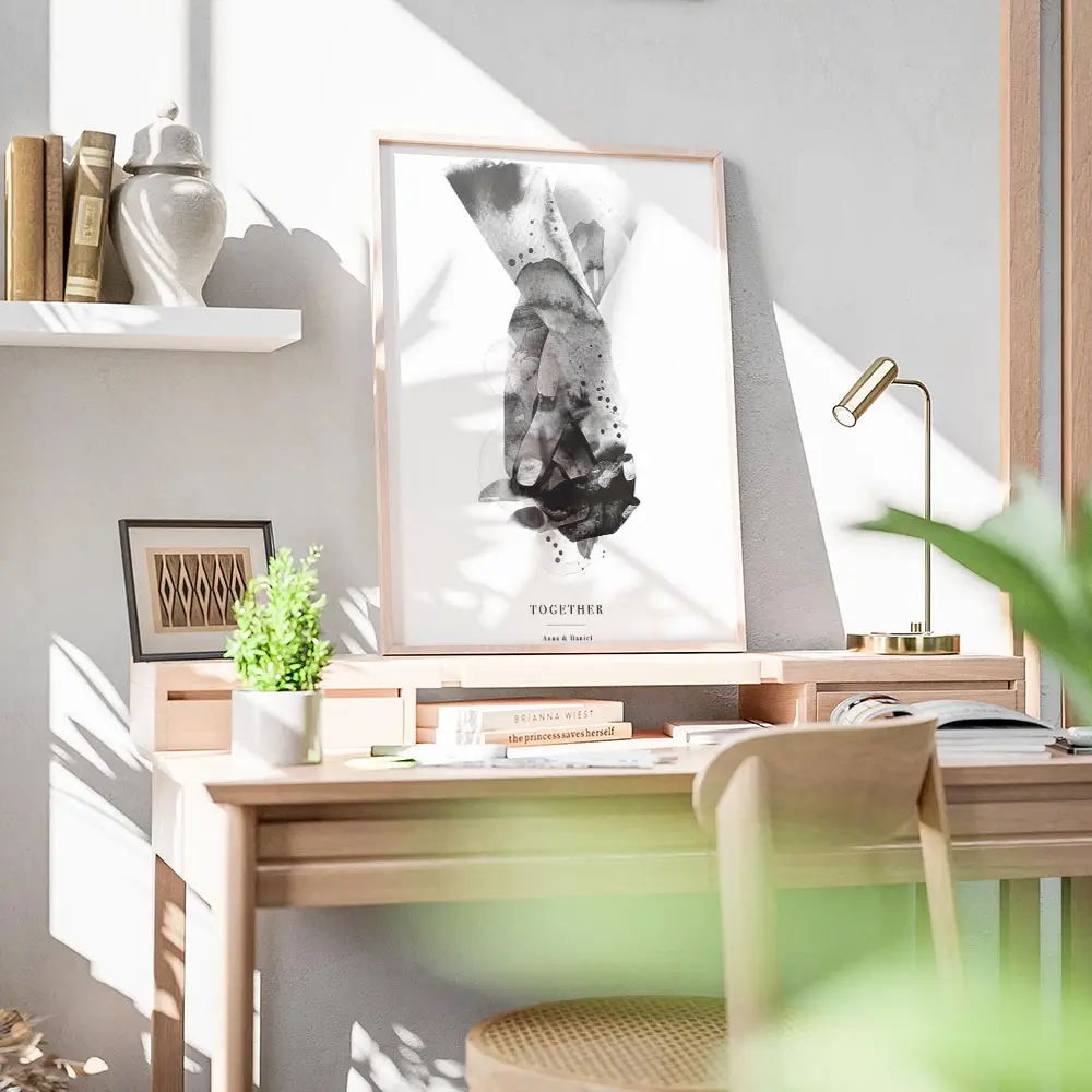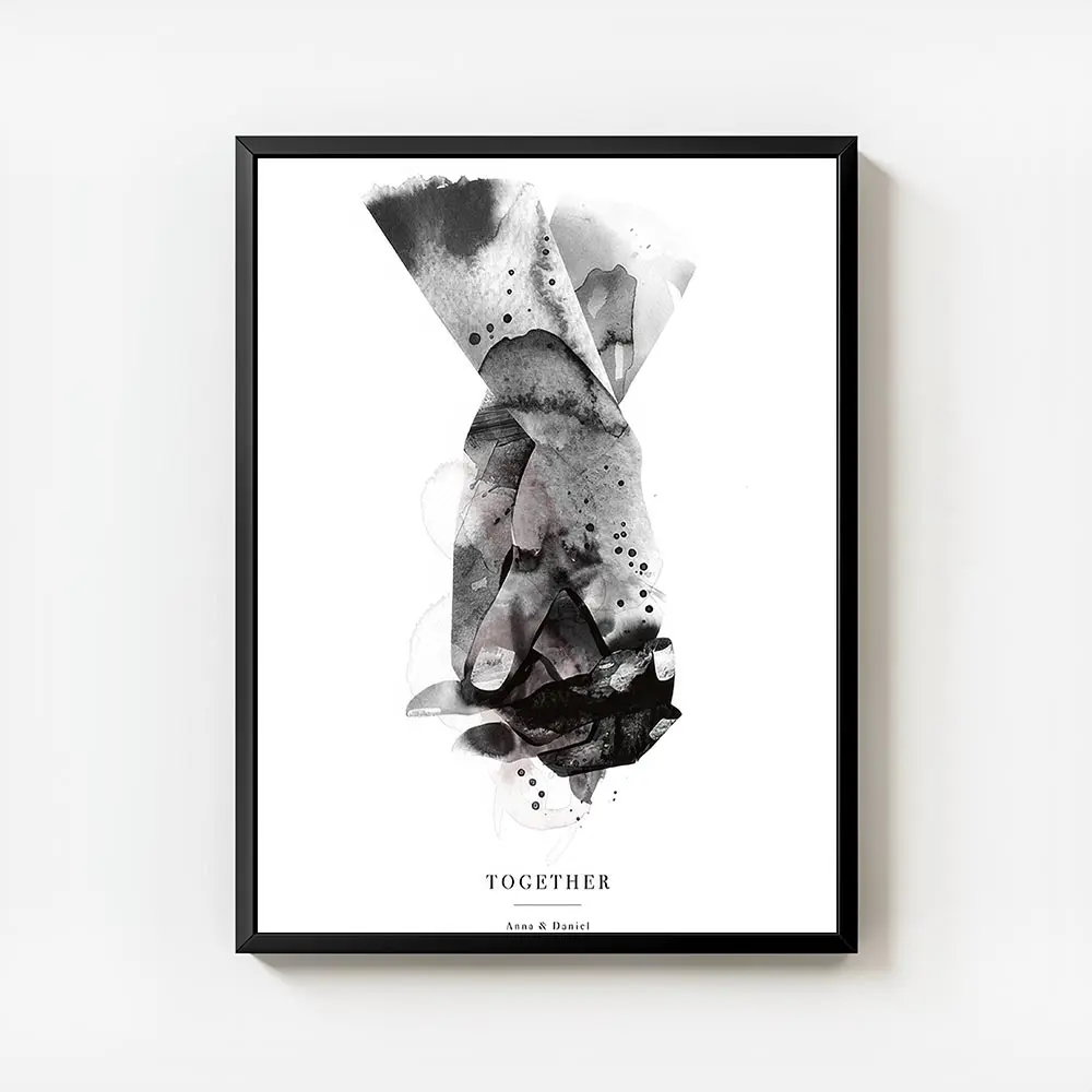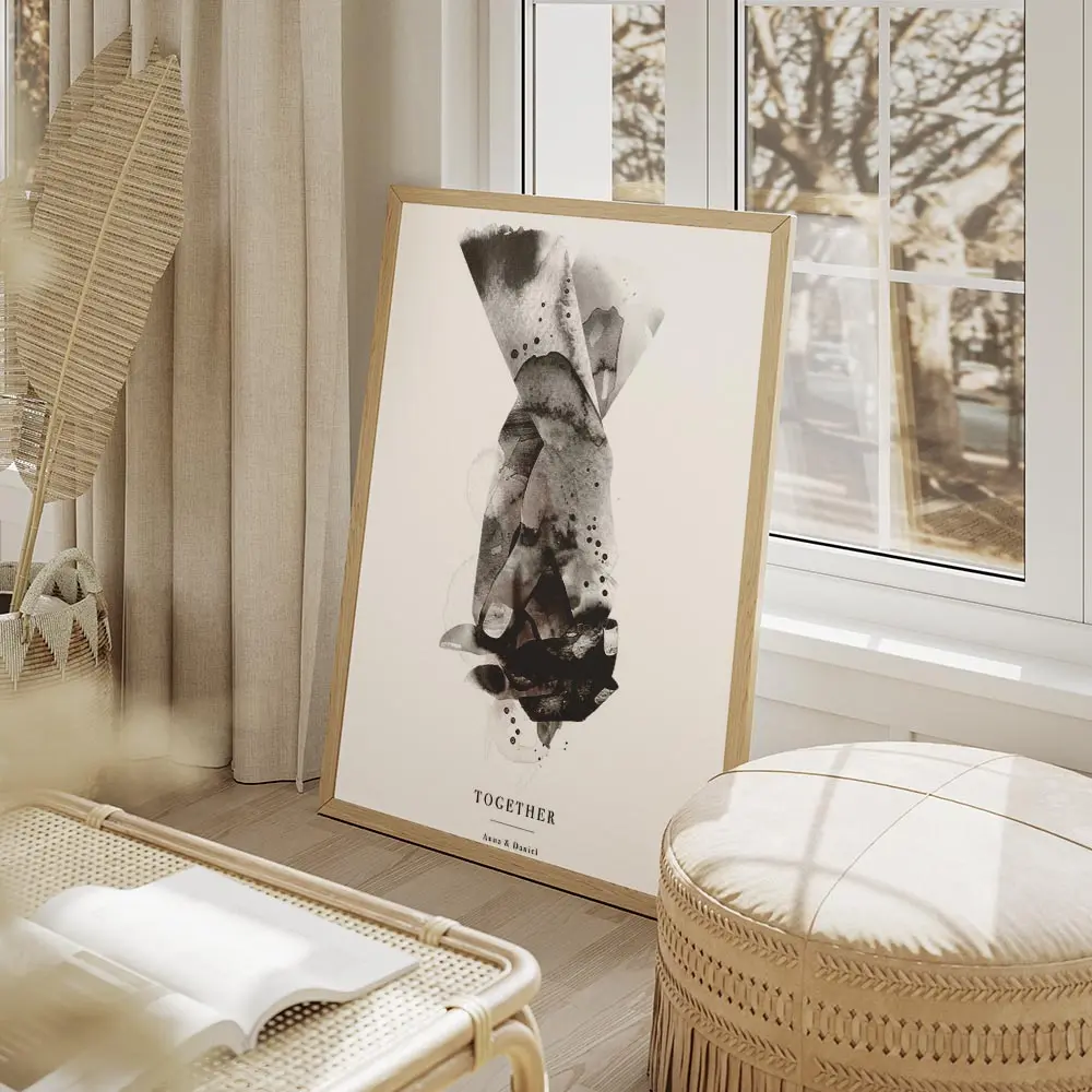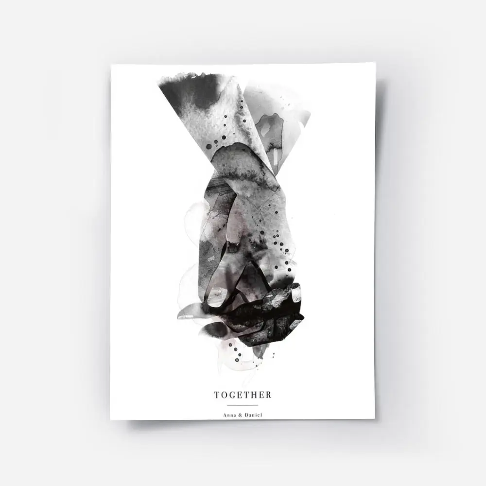Cette Affiche aquarelle deux mains entremêlées joue la simplicité. On voit deux mains enlacées, dessinées au pinceau, posées au centre sur un fond blanc épuré. Les tons sont noir et gris, avec des lavis qui vont du gris pâle au noir profond. Le geste apparaît dans des traces de pinceau, des bords légèrement flous et quelques petites éclaboussures d’aquarelle.
