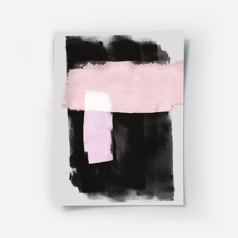 Cette Affiche formes abstraites noires roses aquarelle propose un ensemble de formes peintes à l'aquarelle sur un fond gris. On voit des taches noires denses, des lavis roses aux bords estompés et des zones où les couleurs se superposent. Le papier montre une légère texture, avec des dégradés de rose pâle et des touches de noir plus soutenu. L’équilibre entre le noir profond et le rose délicat crée un contraste élégant, simple et apaisant.
