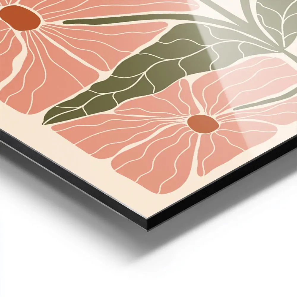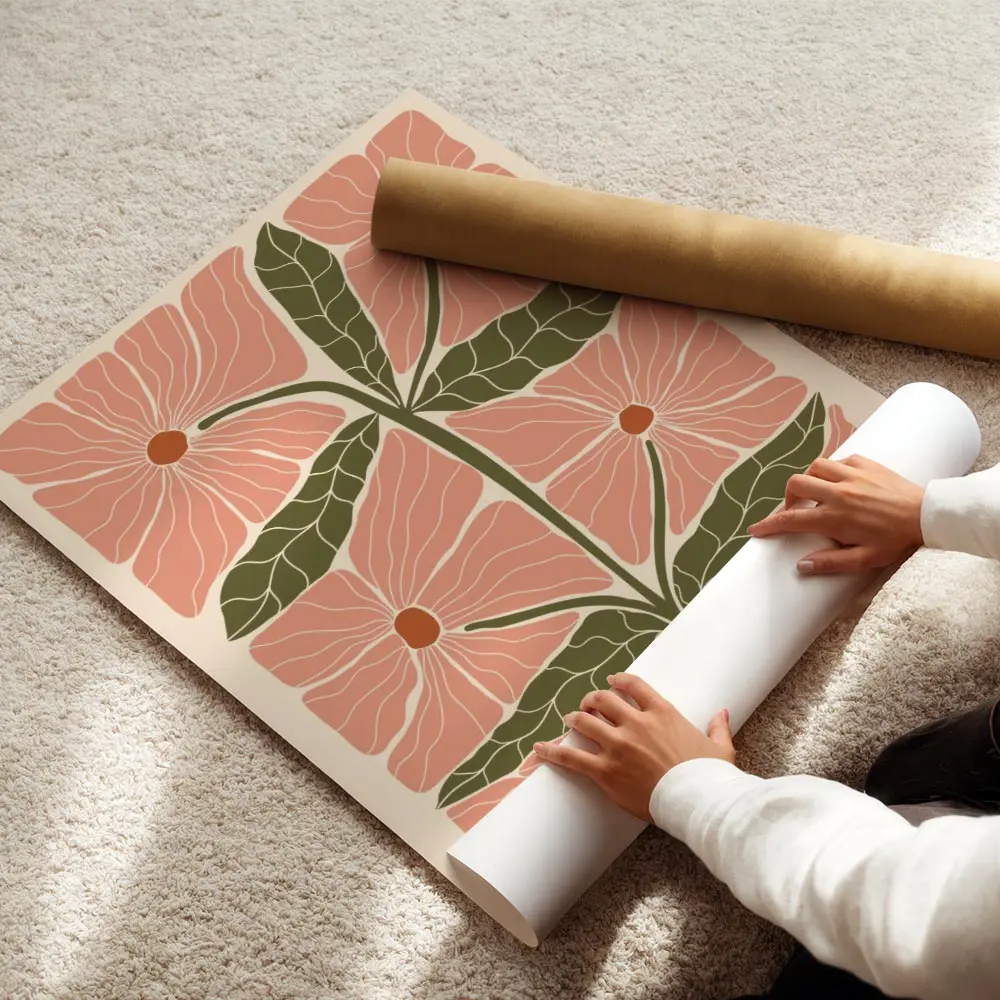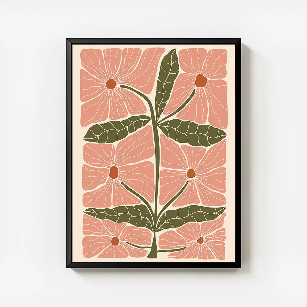 Cette Affiche grandes fleurs roses et feuilles donne tout de suite une impression douce et moderne. On voit de grandes fleurs roses stylisées, des formes carrées en arrière-plan, et des feuilles vertes qui rythment l’ensemble. L’ambiance reste graphique et chaleureuse, simple et efficace.