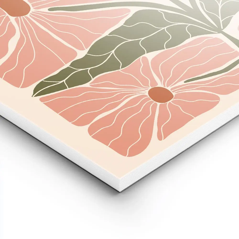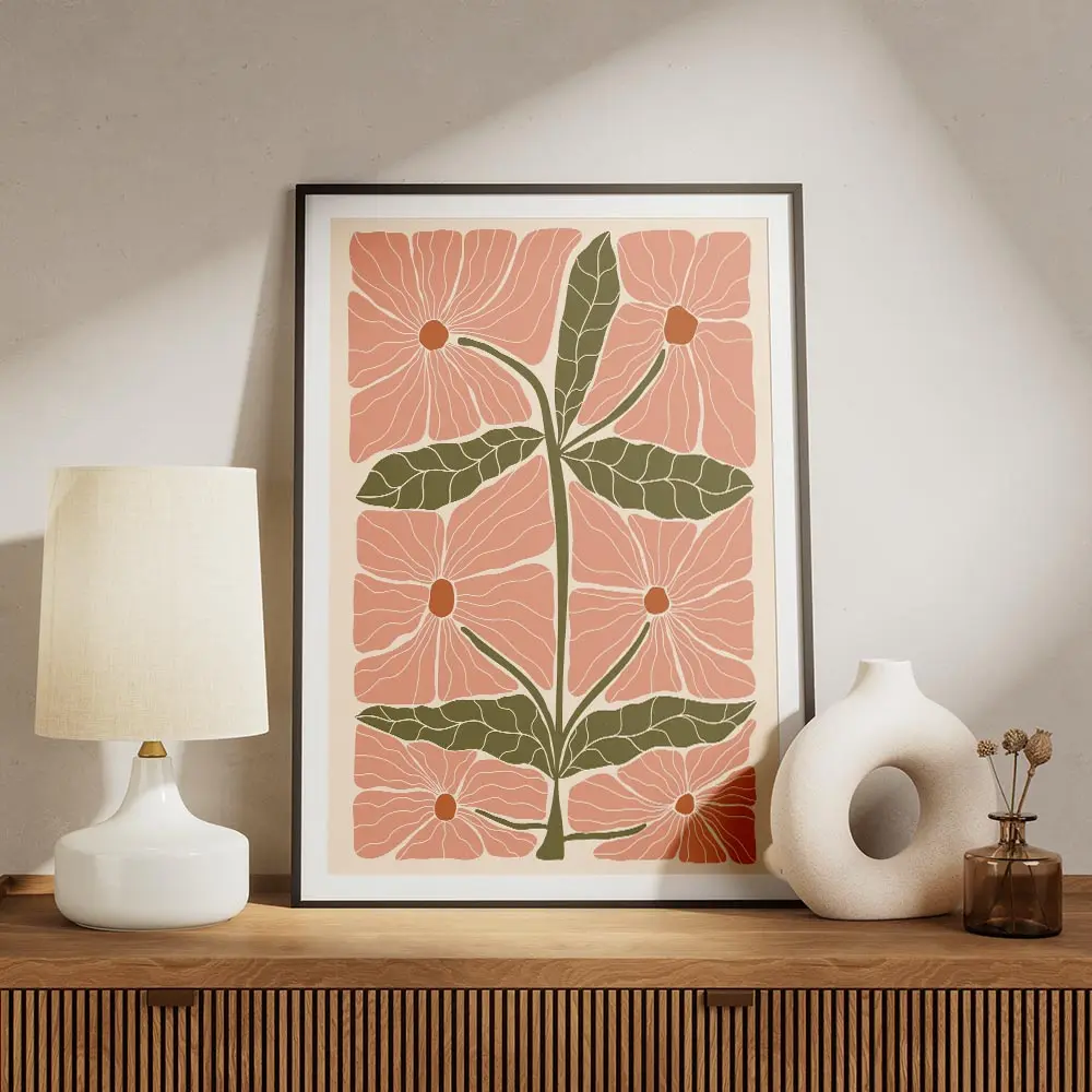 On peut la poser sur un mur blanc pour faire ressortir le rose, ou sur un mur sable pour une ambiance plus douce. Elle va bien avec des coussins roses ou verts, un cadre fin en bois clair et des plantes en pot. Pour compléter, on jette un œil à nos posters fleurs ou à la sélection art abstrait.