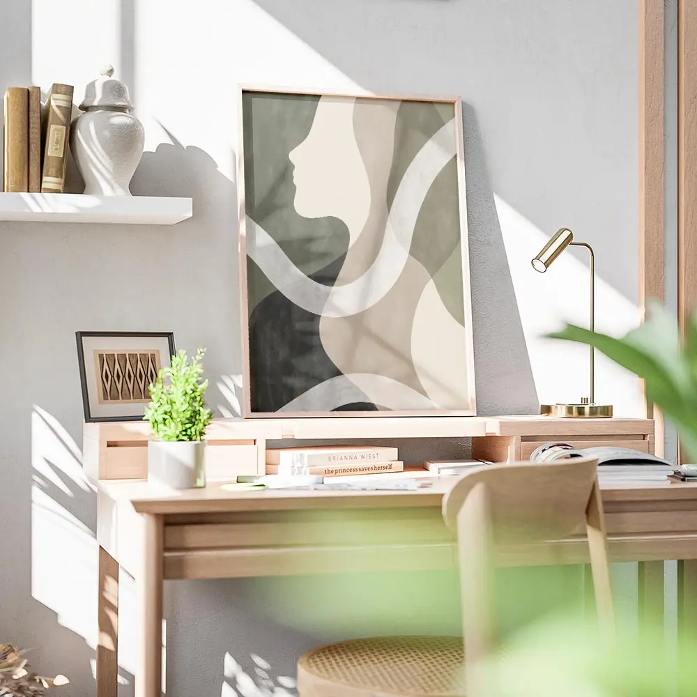 Sur un mur blanc ou crème, les tons ressortent et gardent une atmosphère douce. On l’encadre avec un cadre fin noir ou en bois clair, on ajoute une plante verte et quelques coussins terre cuite pour créer du contraste. Idéal dans un salon, une chambre ou un bureau. Pour harmoniser l’ensemble, découvrez nos pages sur l’art abstrait et l’illustration et graphique.