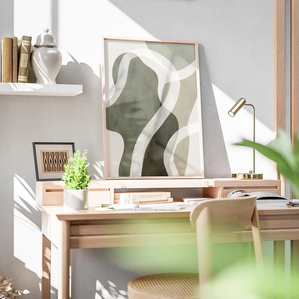 Pour l’association, on privilégie des tons neutres et des matières naturelles. Un cadre noir ou bois clair, une lampe métallique et des textiles crème suffisent à laisser respirer l’œuvre. Cette pièce trouve sa place dans un salon lumineux, une chambre au calme ou un bureau épuré. Vous pouvez aussi explorer nos abstraits ou nos affiches géométriques pour composer un mur qui parle.