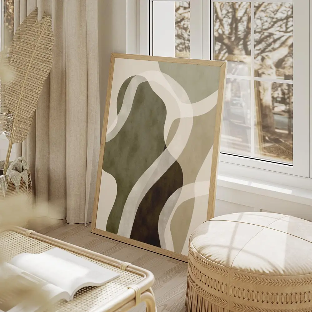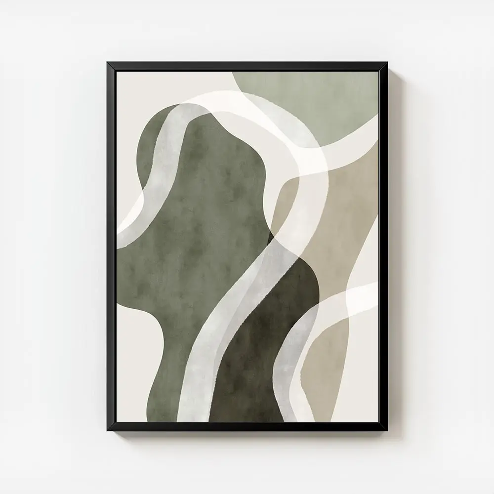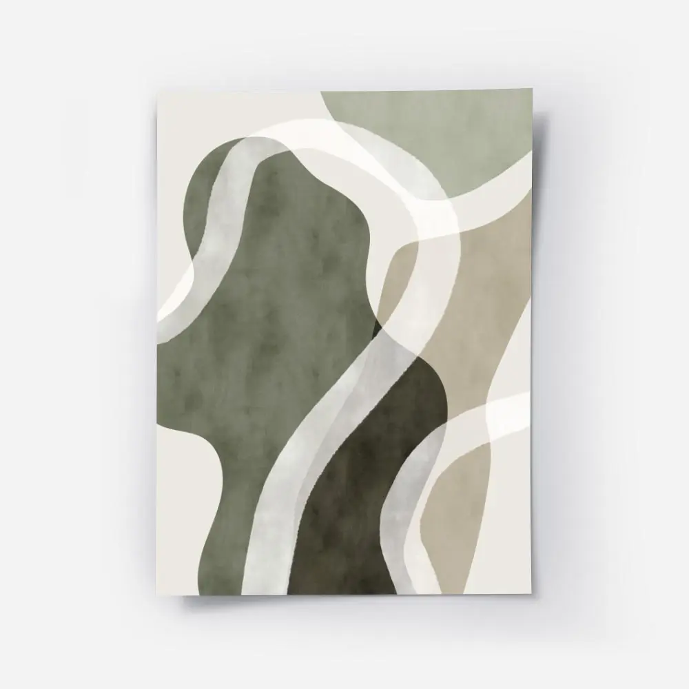 On découvre une composition qui respire une énergie tranquille. Cette Affiche abstraite formes vertes beiges lignes blanches attire le regard par son équilibre et sa dynamique mesurée. Le fond clair met en valeur les formes vertes et beiges et les lignes blanches qui les relient. La lumière paraît se poser doucement sur la scène graphique, comme si chaque ligne dessinait une respiration.