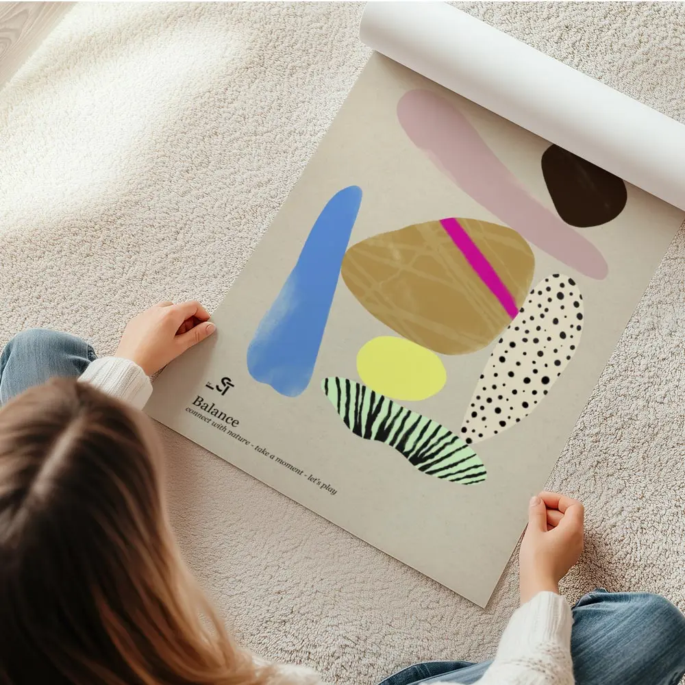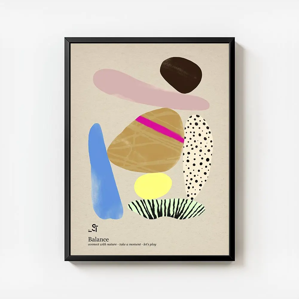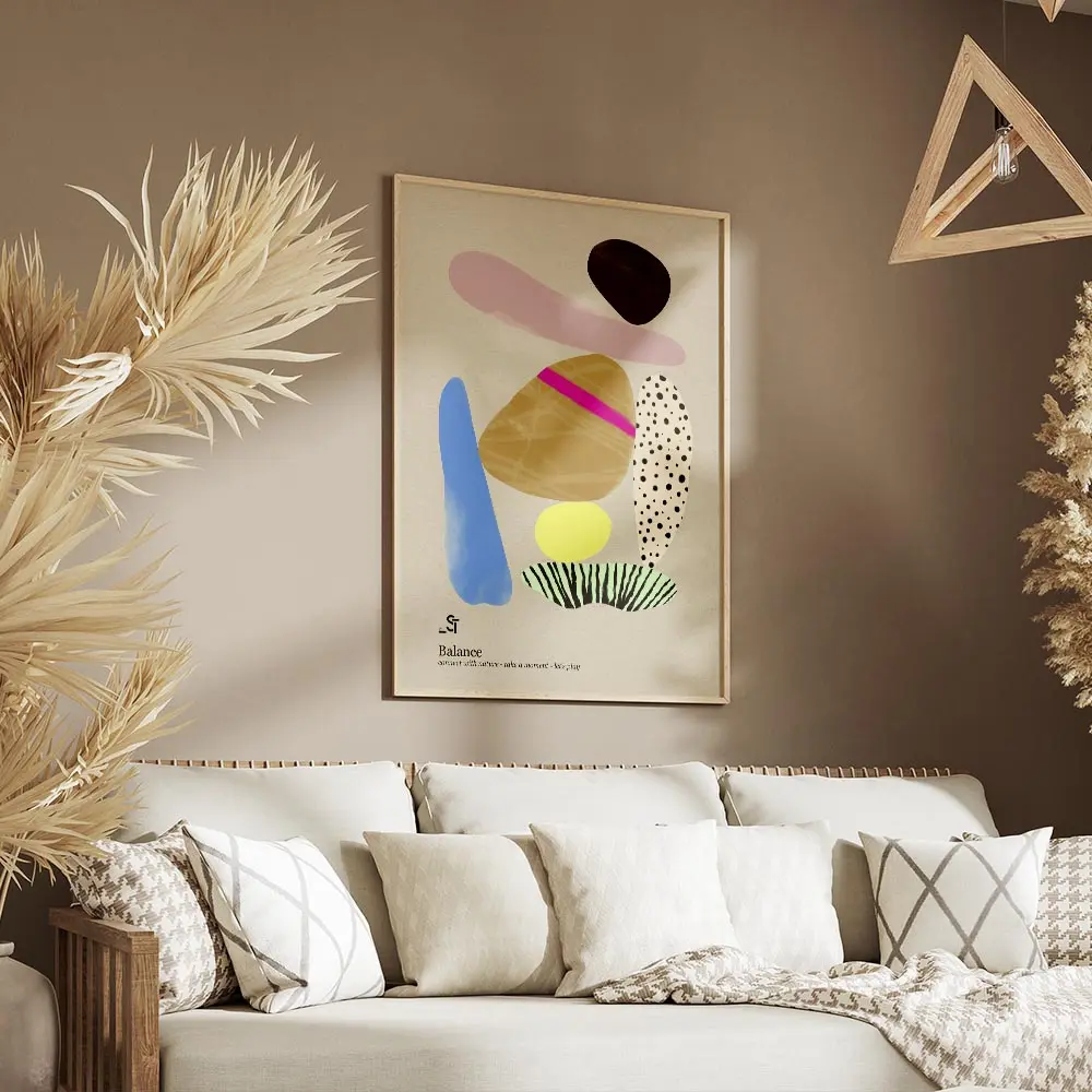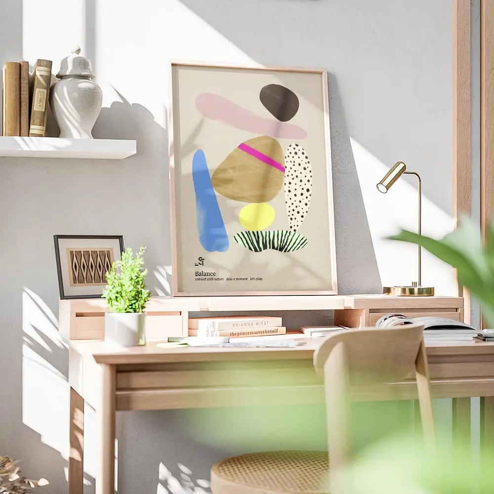 Sur un mur blanc ou beige, les couleurs ressortent immédiatement. On mélange des cadres fins, du bois clair et quelques plantes vertes pour adoucir l'espace. Il se marie bien avec coussins naturels, paniers tressés et lampes en rotin. Pour rester dans le même esprit, regarder nos sélections d'art abstrait ou d'illustrations graphiques.
