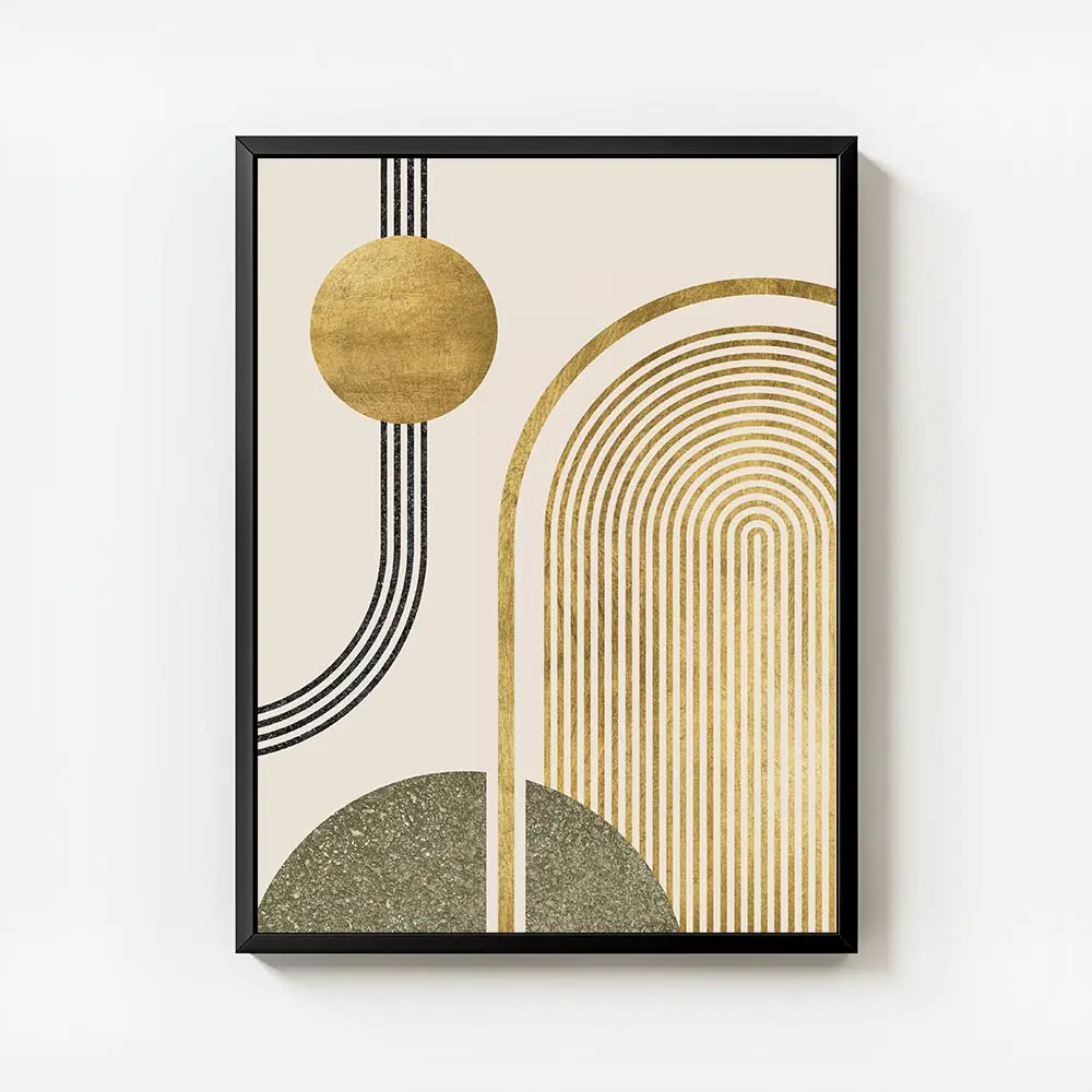 Cette Affiche cercle et arche dorés vert saisit par sa simplicité. On voit un fond beige doux, un grand cercle doré et une arche dorée qui se répondent. Des lignes noires fines traversent la composition, et une forme verte arrondie vient casser le rythme, apporter du contraste.