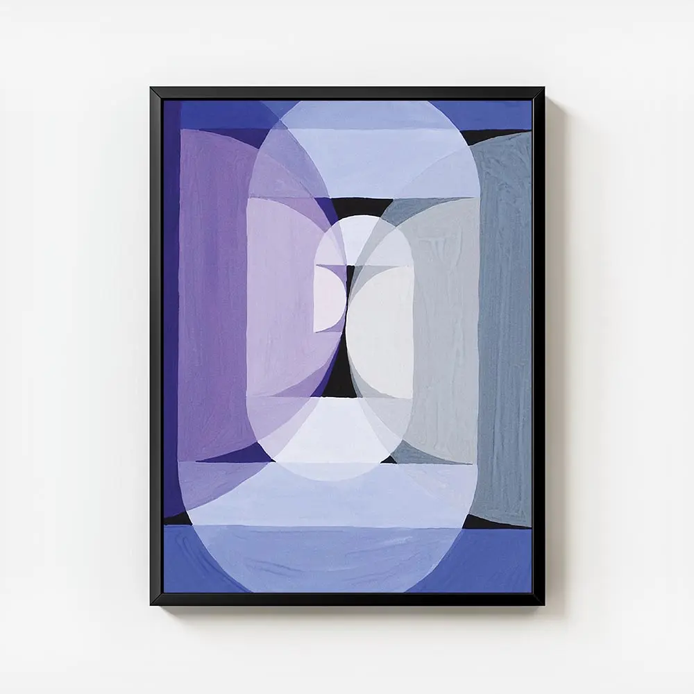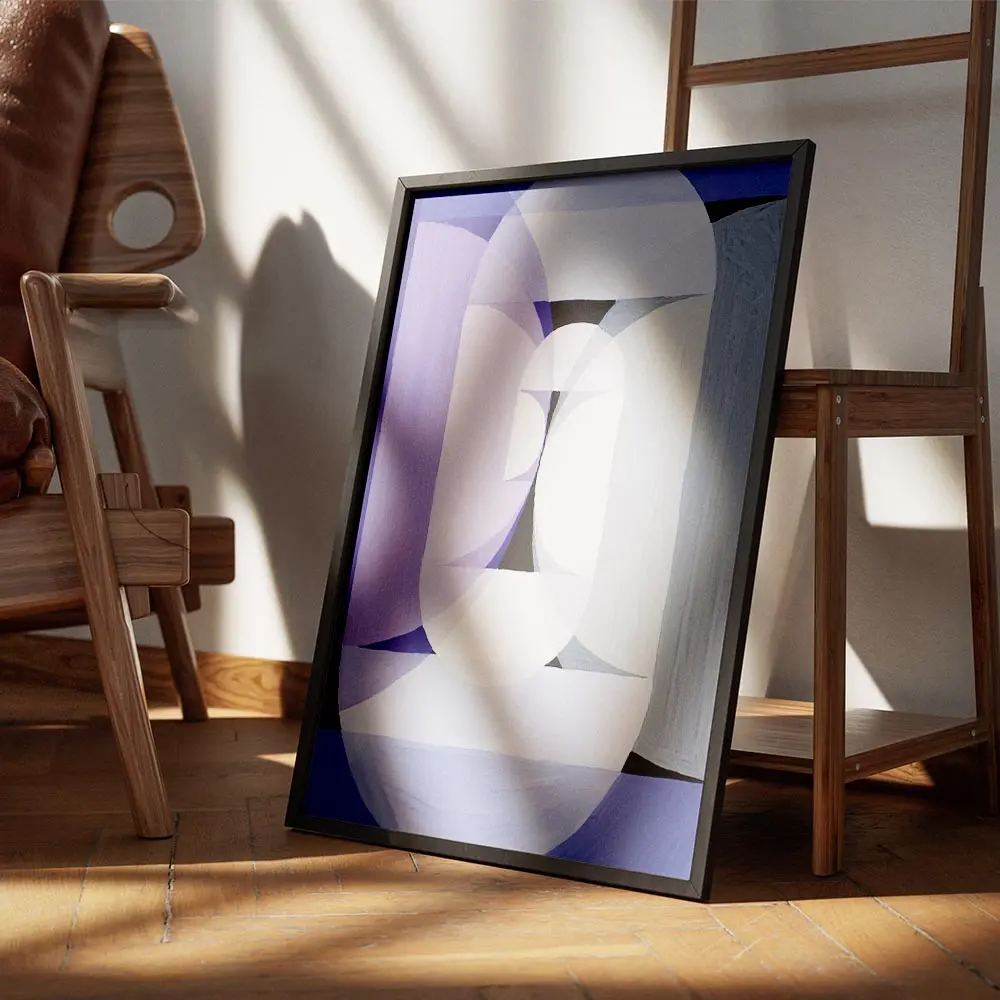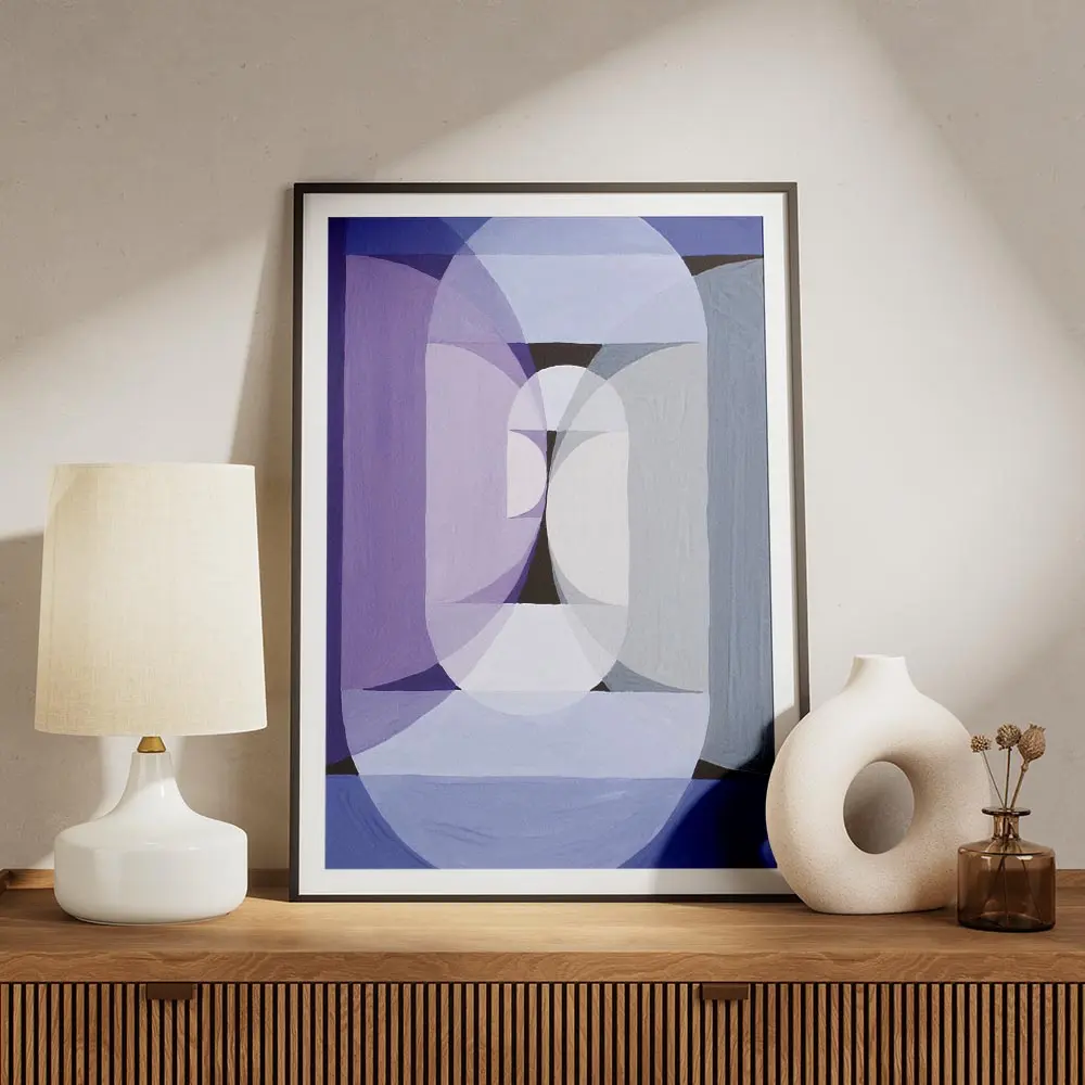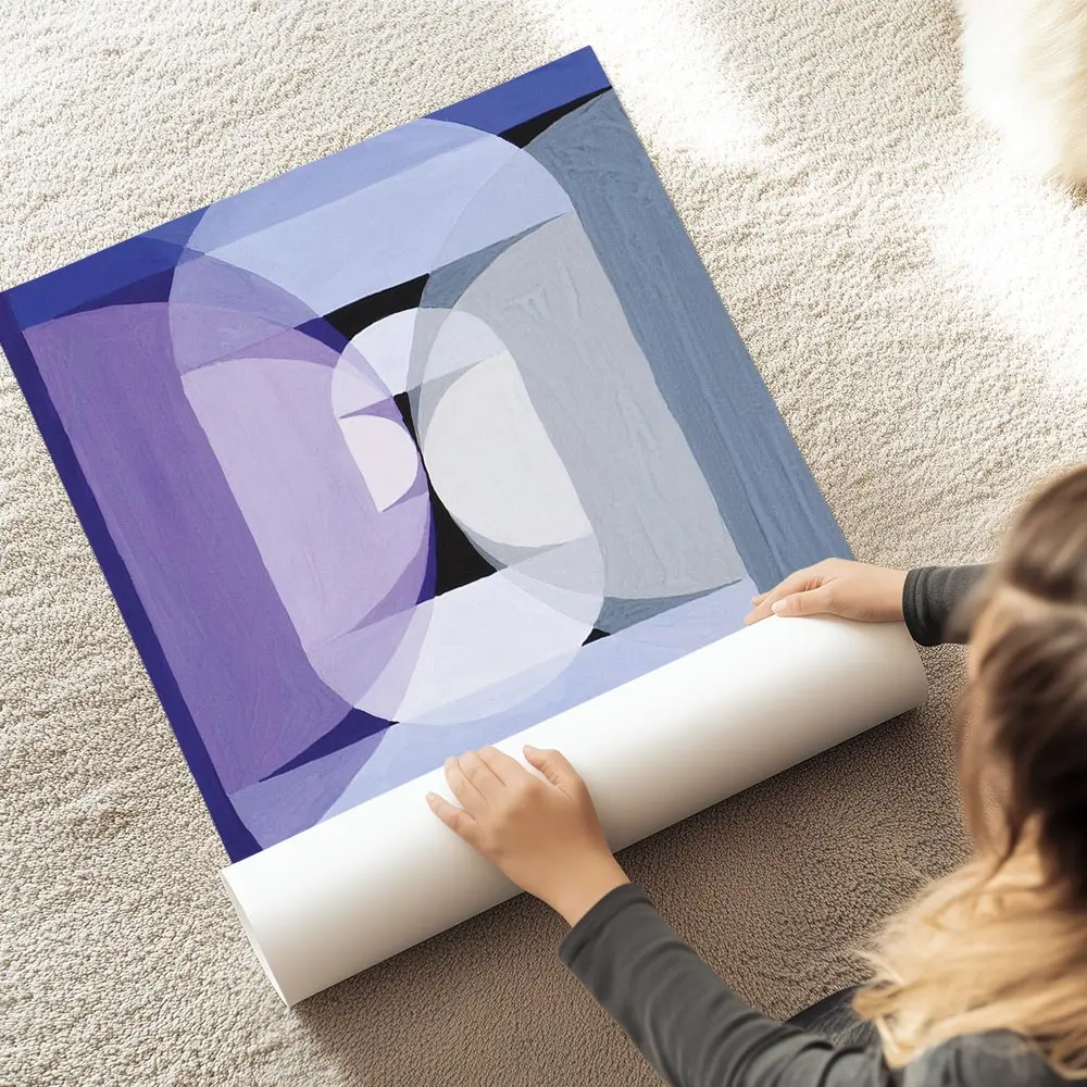 On aime ce visuel net et posé. Ce poster, Affiche cercle violet formes géométriques bleues, affiche un grand cercle violet posé au centre, des formes géométriques bleues et des touches grises qui jouent autour, sur un fond clair. L'ensemble donne une sensation calme, presque graphique, très maîtrisée.