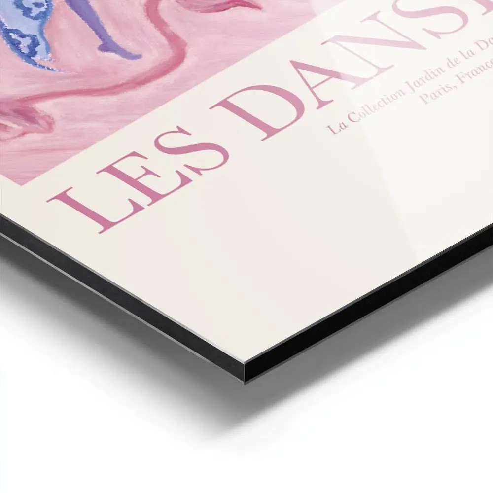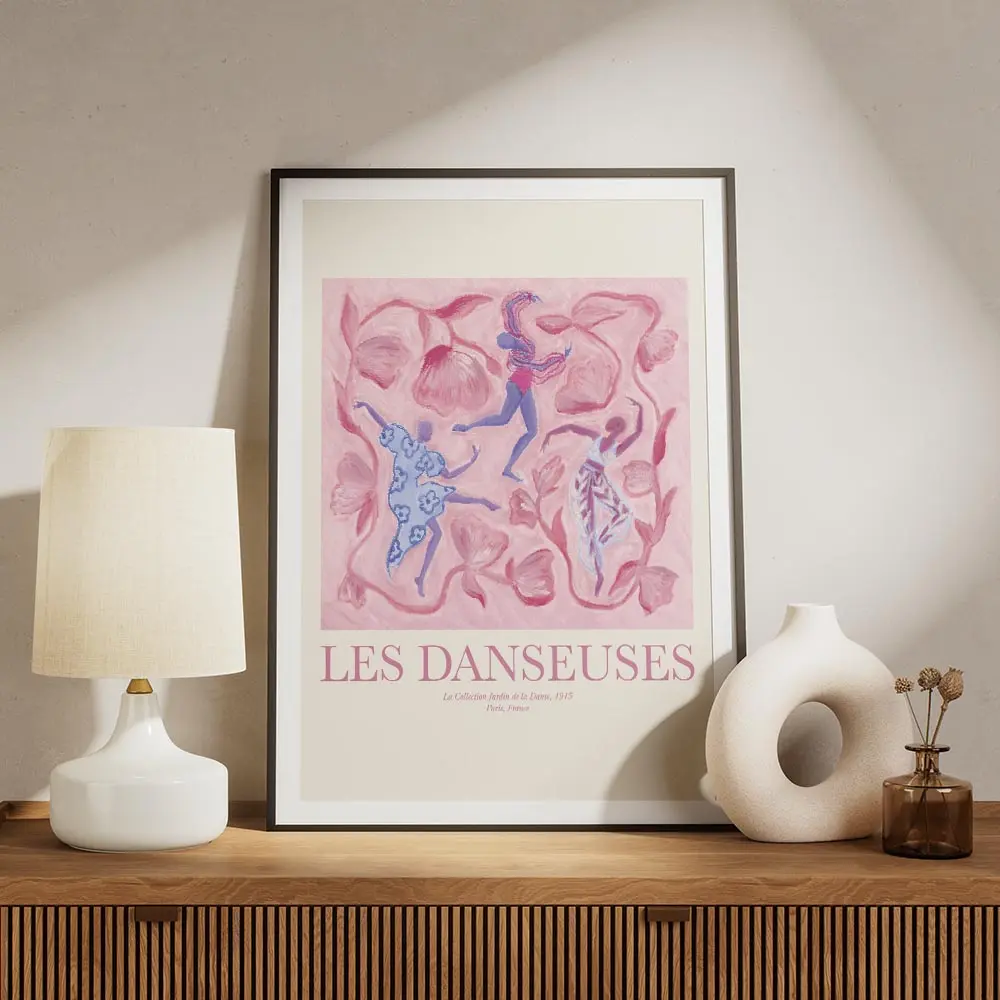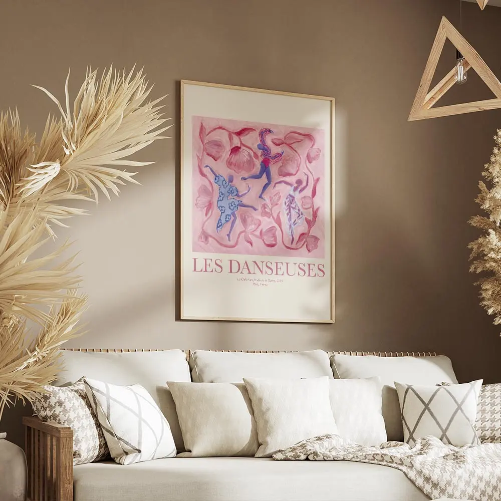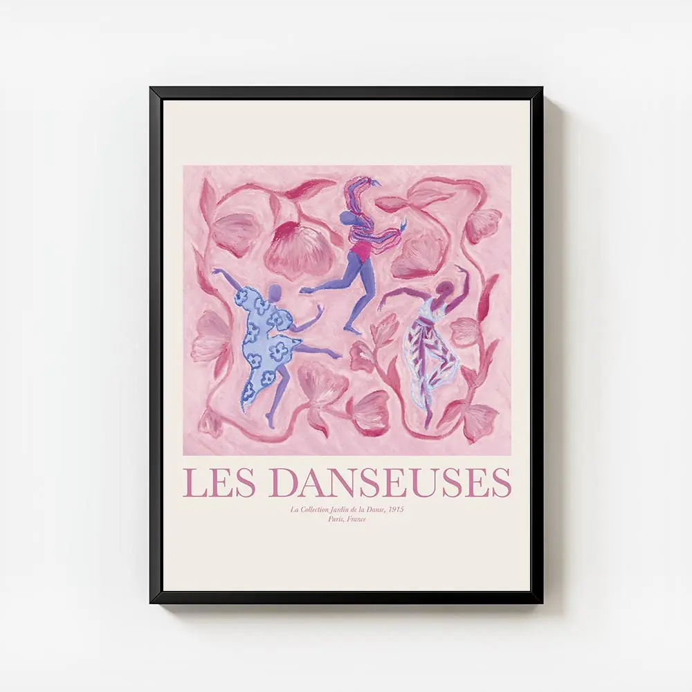 Ce Affiche danseuses abstraites vibrantes capte tout de suite l'attention avec plusieurs silhouettes de danseuses stylisées posées sur un fond floral rose. On remarque des aplats de couleur très vifs, des taches et des traits qui soulignent le geste. Les silhouettes gardent une forme simple, bras et jambes esquissés, tête inclinée ici et là. L'image donne une sensation de mouvement, de flux, presque de musique.