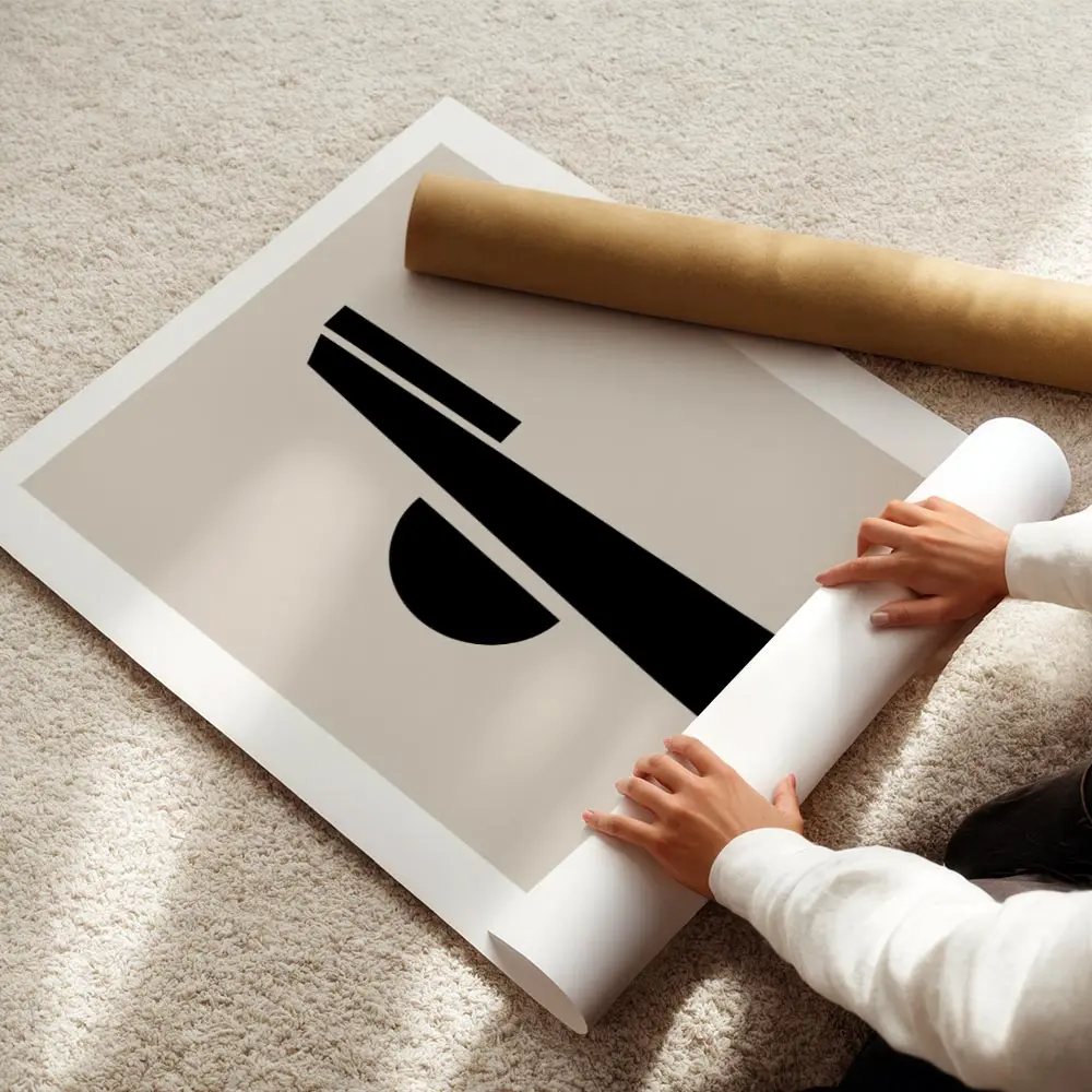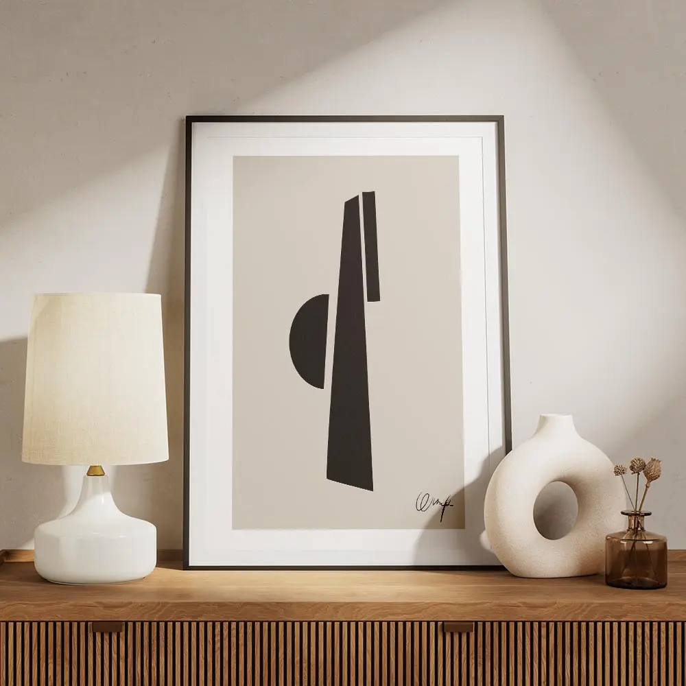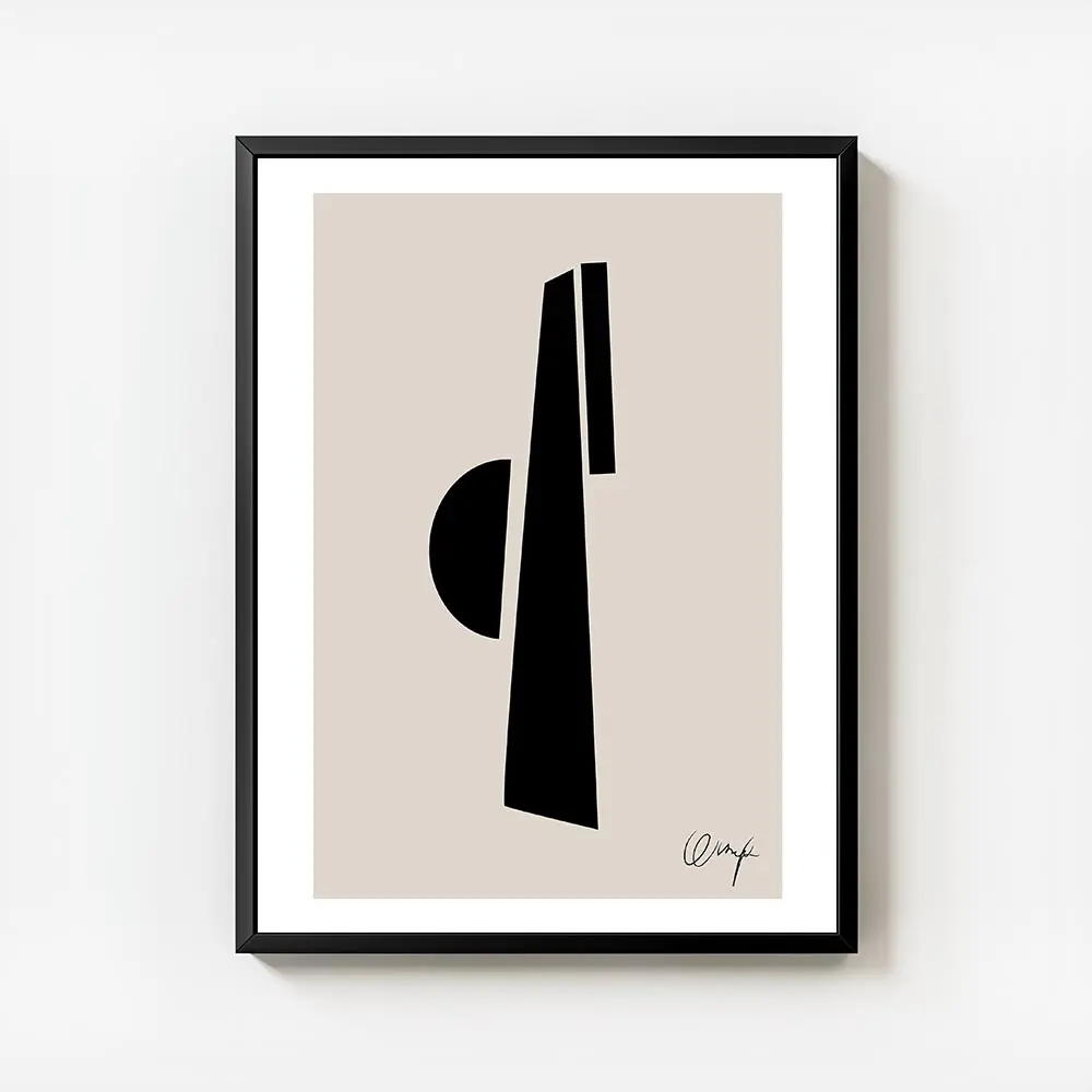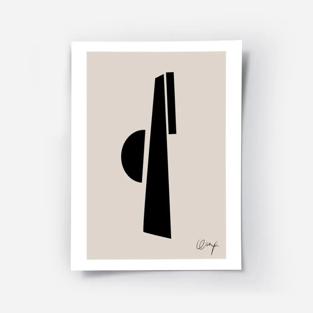 Cette Affiche demi cercle noir lignes épaisses frappe par sa simplicité. On voit tout de suite le fond beige doux et chaud. Au centre, un demi-cercle noir massif capte le regard. Autour, plusieurs lignes épaisses noires apportent du rythme et du mouvement, sans charger l’image. Le rendu reste très graphique, très direct.