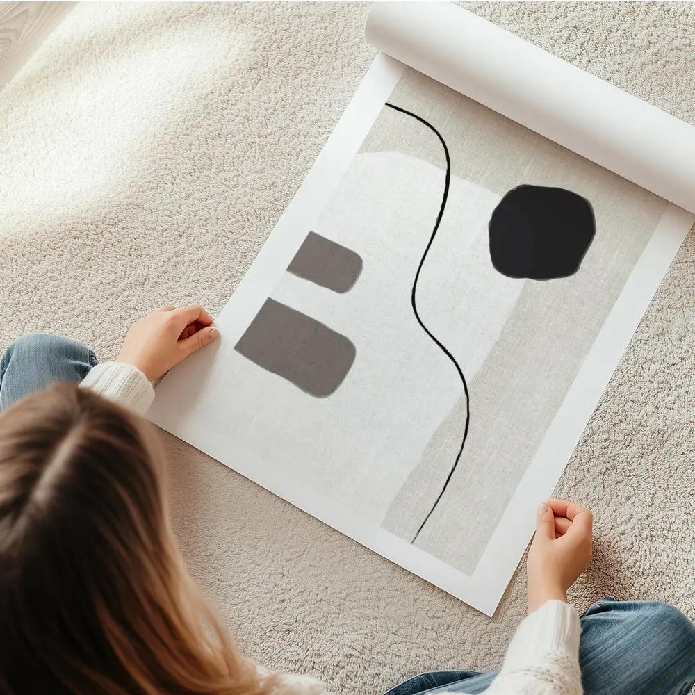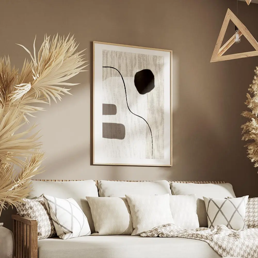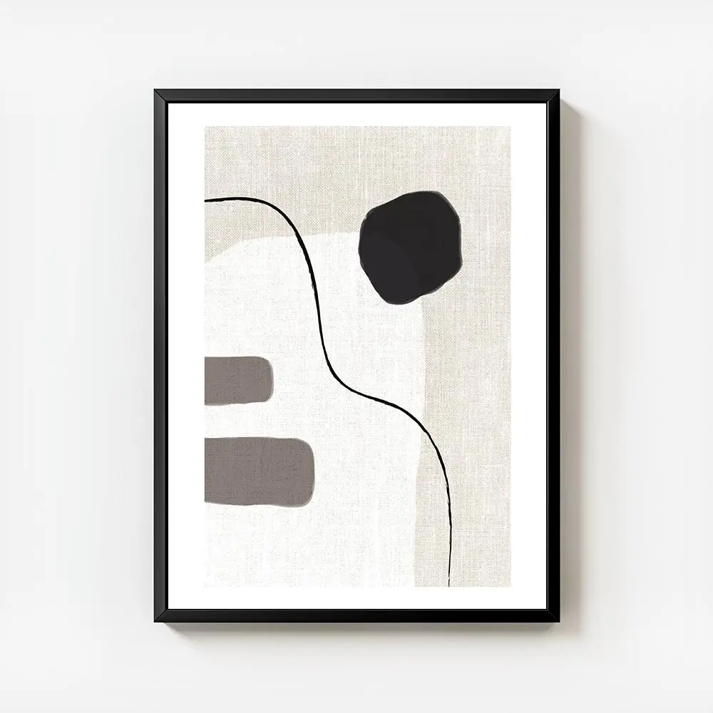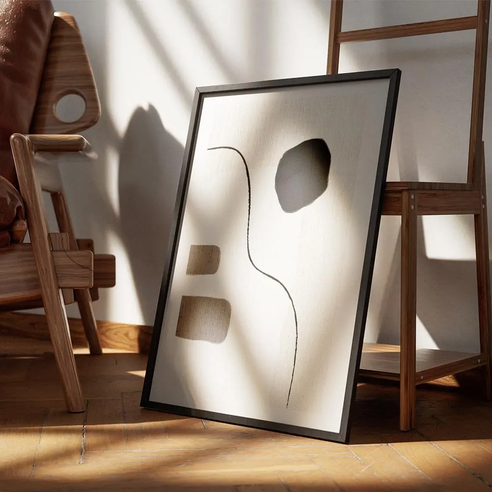 Sur un mur clair, il accentue l’aspect minimal. Avec des cadres fins noirs et des meubles en bois clair, l’ambiance devient chaleureuse. Pour aller plus loin, on peut associer d’autres pièces d’art abstrait ou minimaliste, comme celles de art abstrait ou art minimaliste.