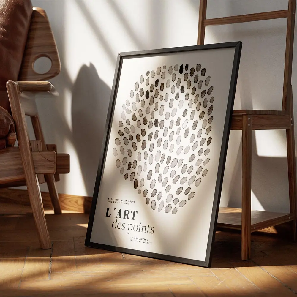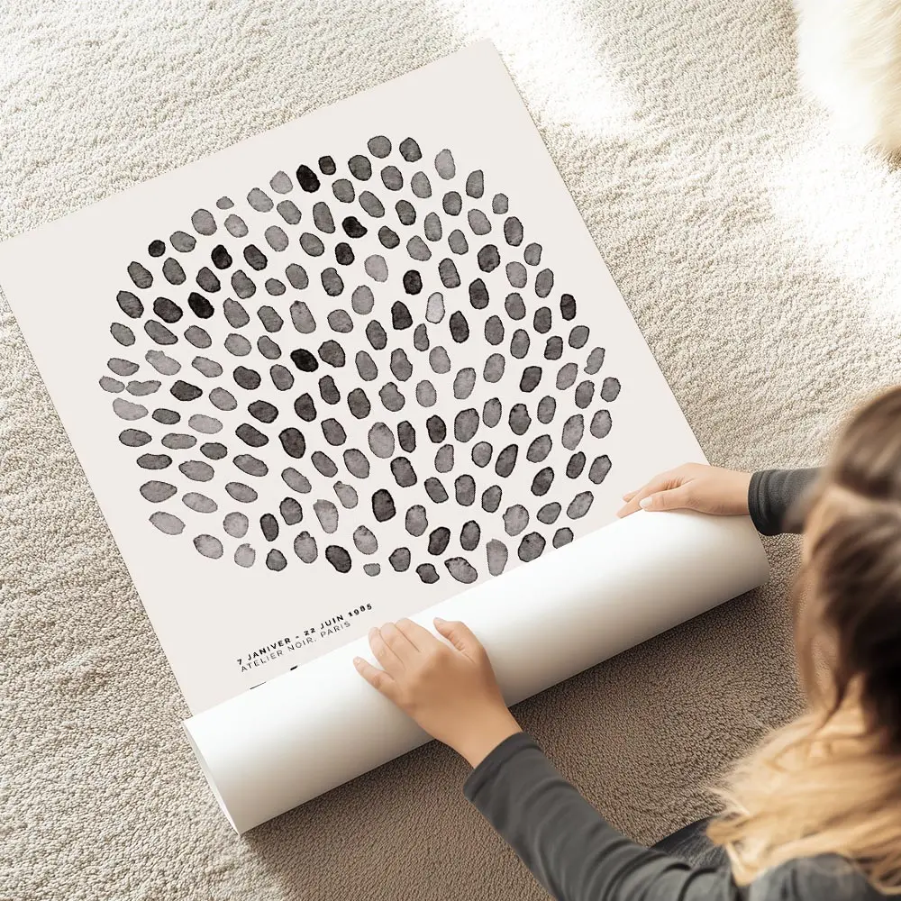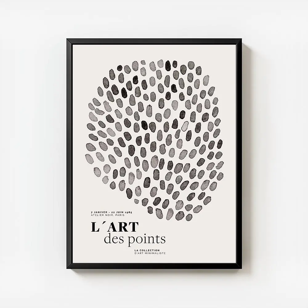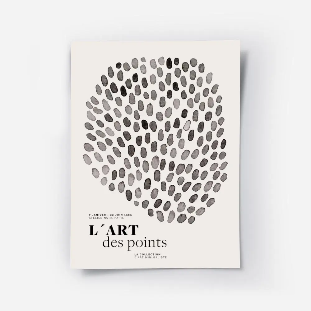 Cette Affiche design points noirs cercle graphique joue sur un visuel pur et simple. On voit des points noirs et gris, de tailles variées, disposés pour former un grand cercle. Le fond reste clair, presque blanc, et donne de l'air au motif. On sent le rythme, on sent le mouvement, petit à petit.