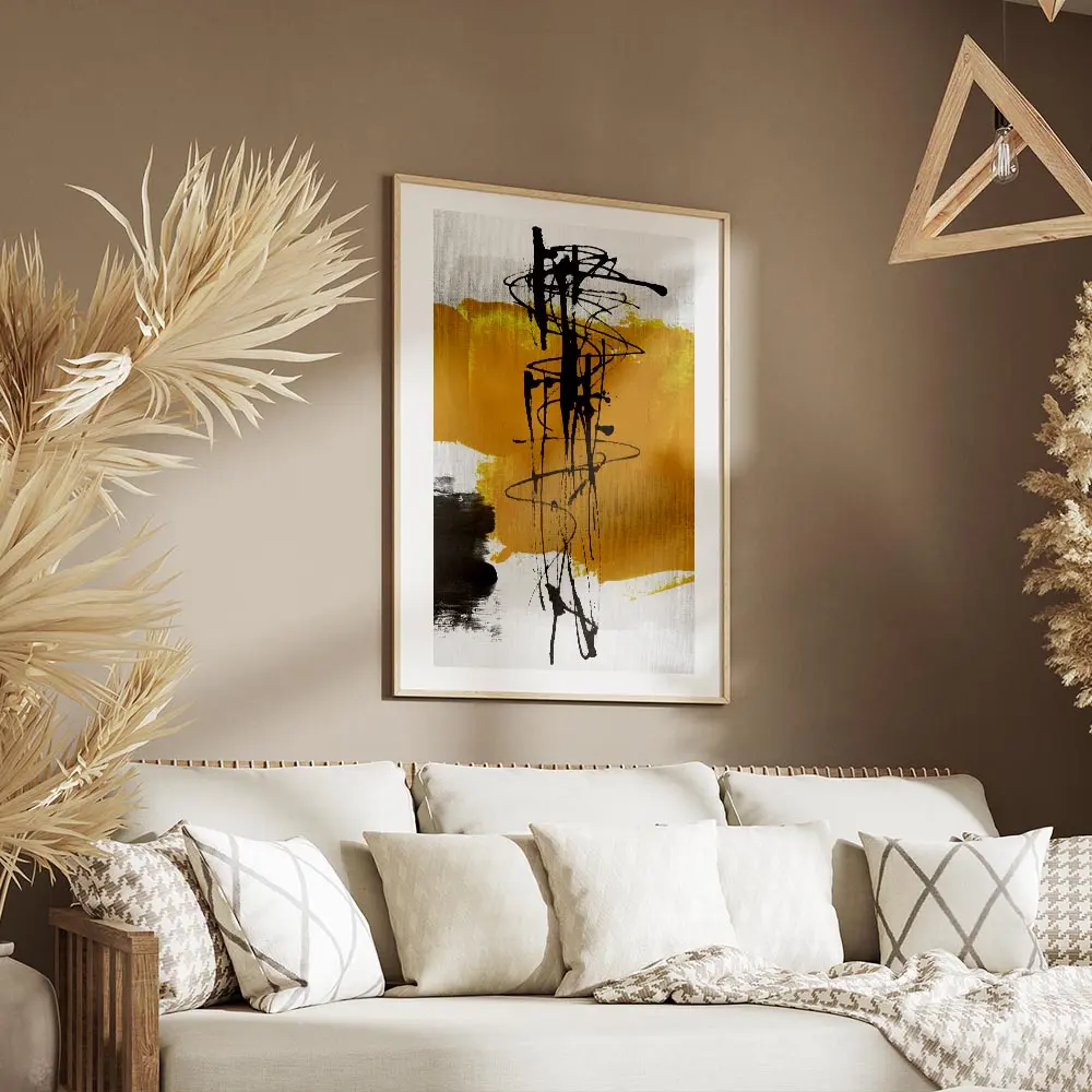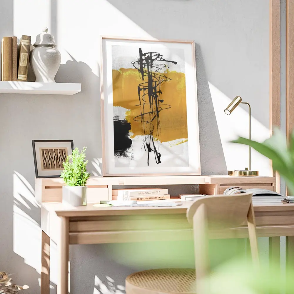 On accroche ce poster dans un salon ou un bureau, sur un mur blanc ou gris pâle. On ajoute des pièces en bois clair, textiles neutres, et quelques accessoires jaunes pour faire écho aux formes. Pour continuer dans la même veine graphique, on peut explorer nos posters art abstrait ou nos posters graphisme.