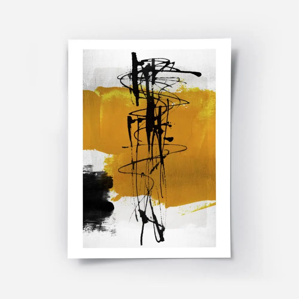 Ce poster Affiche formes abstraites noir jaune fond gris joue sur un trio simple: gris, noir et jaune. Le fond gris clair révèle une texture subtile qui rappelle un papier légèrement froissé. Des formes noires, plutôt organiques, se répondent à des formes jaunes plus petites et vives. On voit des superpositions et des espaces vides qui laissent respirer la composition, et des contours nets qui définissent chaque silhouette.