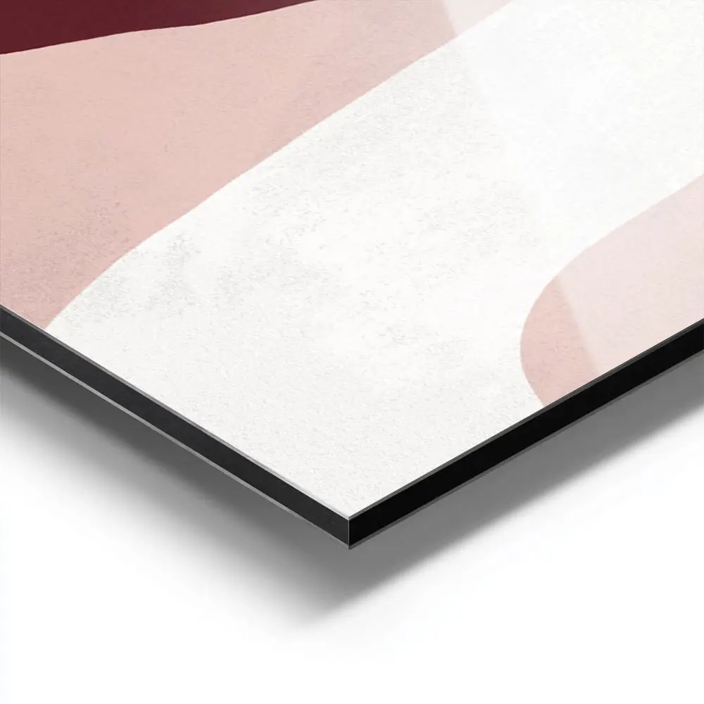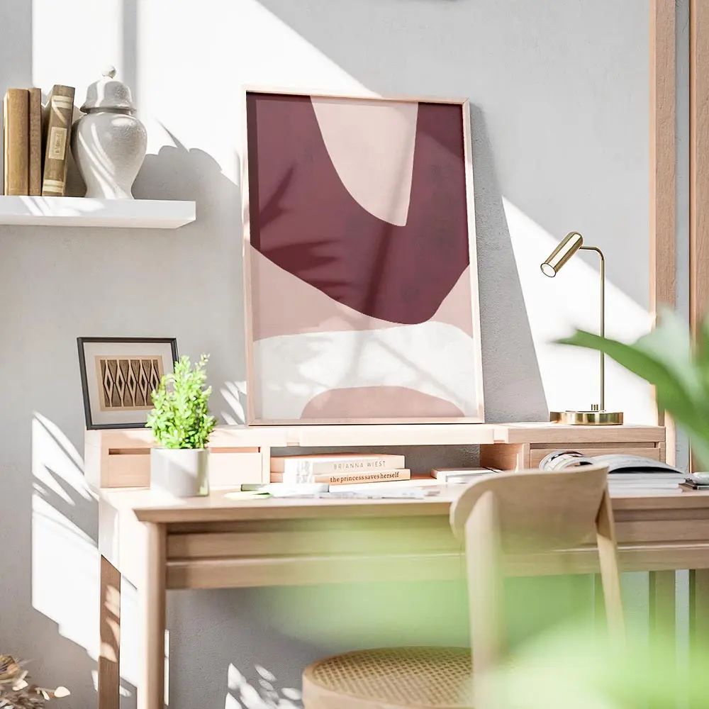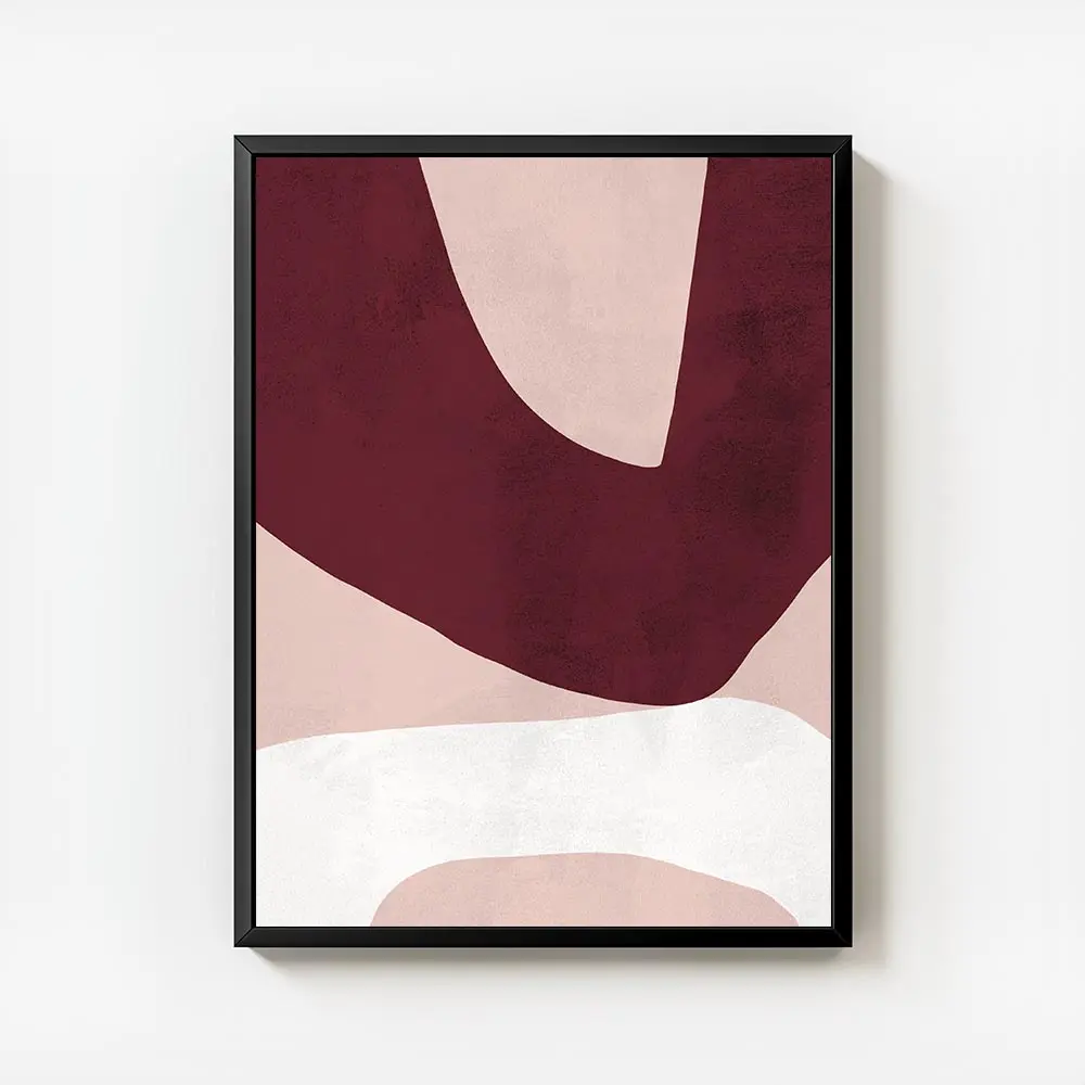 Cette Affiche formes asymétriques bordeaux et rose joue avec des aplats et des courbes. Le rendu reste moderne, simple et chaleureux. On voit tout de suite le contraste entre les tons profonds et les roses clairs, le regard accroche.