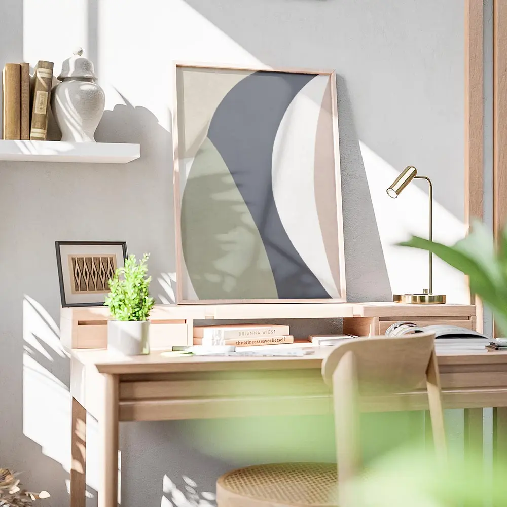 Sur un mur blanc ou beige, les nuances ressortent vraiment. Associe ce poster à des cadres fins noirs ou en bois clair, des plantes vertes pour rappeler le vert, et des coussins unis dans les tons bleus ou roses. Il s’accorde bien avec du mobilier scandinave ou contemporain, simple et épuré. Pour aller plus loin, regarde nos sélections de posters graphisme ou d'art minimaliste.