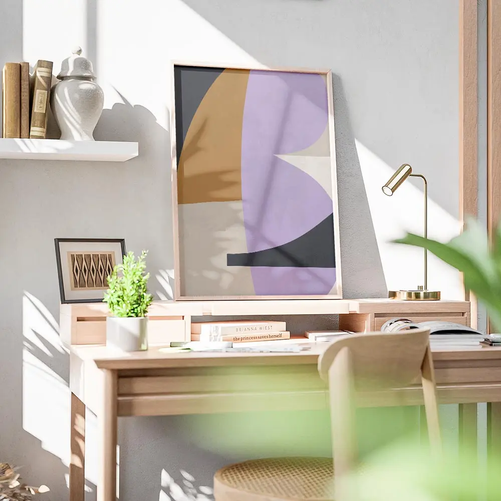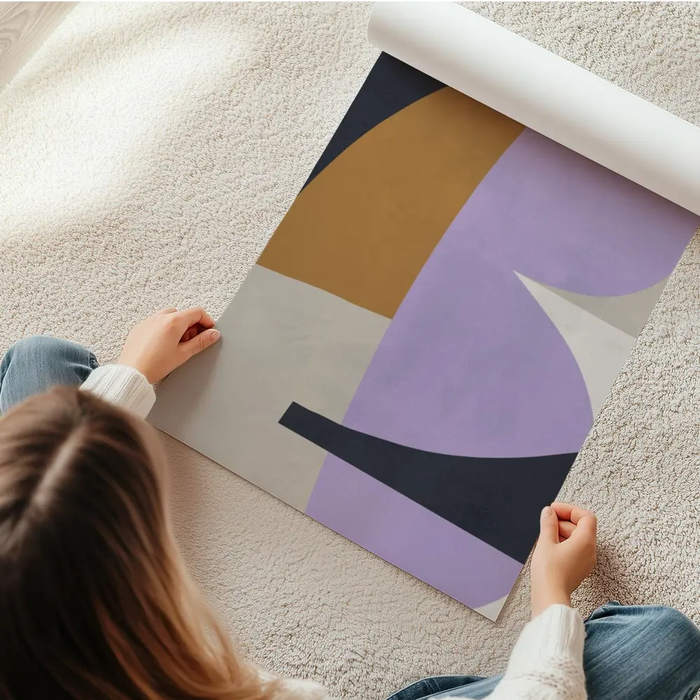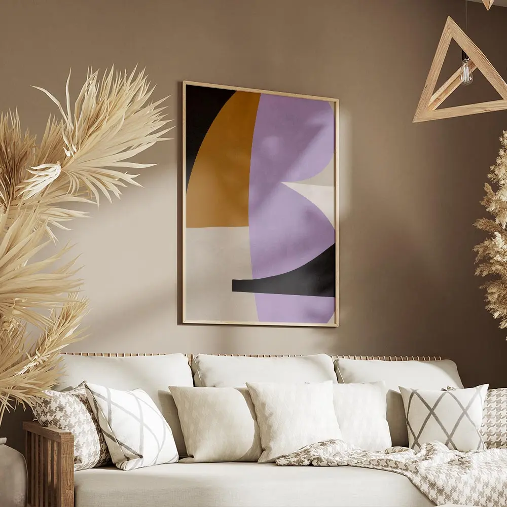 Ce Affiche formes lilas orange et beige capte l’œil avec un jeu de masses simples. On voit de larges aplats lilas, des touches d’orange vif et des surfaces beige chaudes. Les formes restent irrégulières, arrondies et superposées, avec des bords doux et des espaces blancs qui respirent.