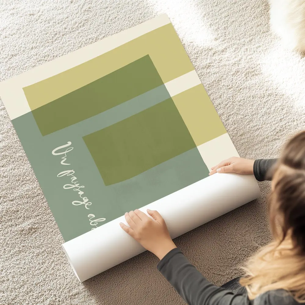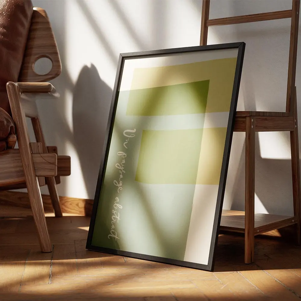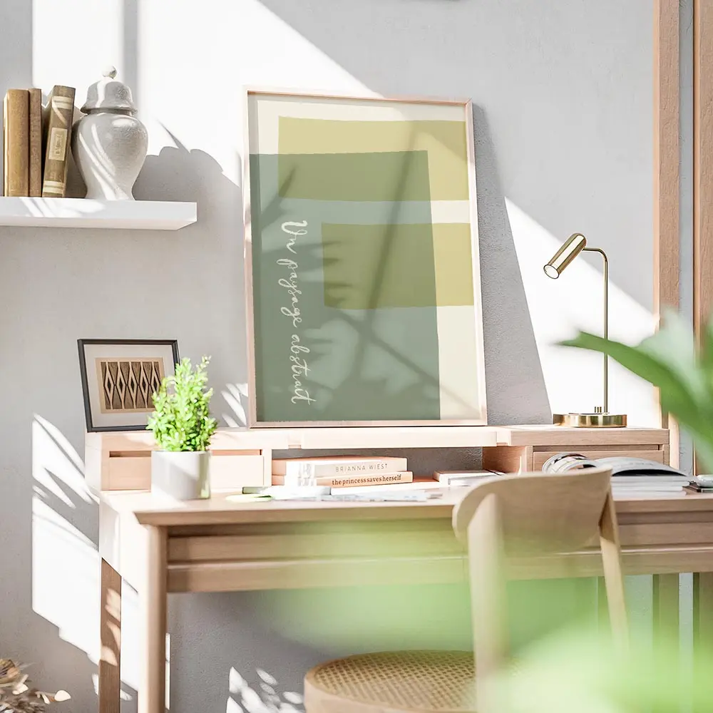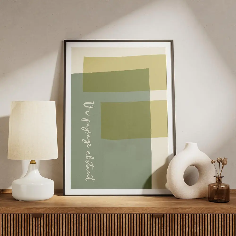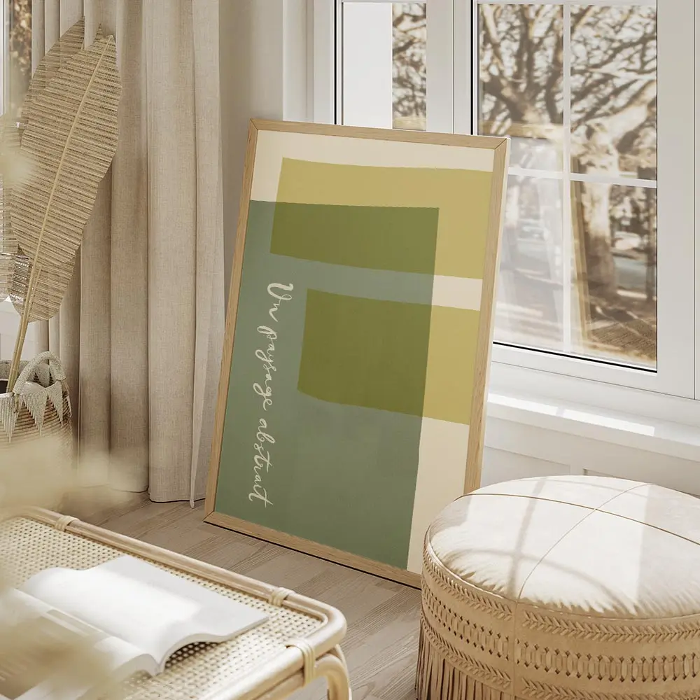 affiche avec des formes rectangulaires et courbes aux couleurs vert sauge jaune .webp