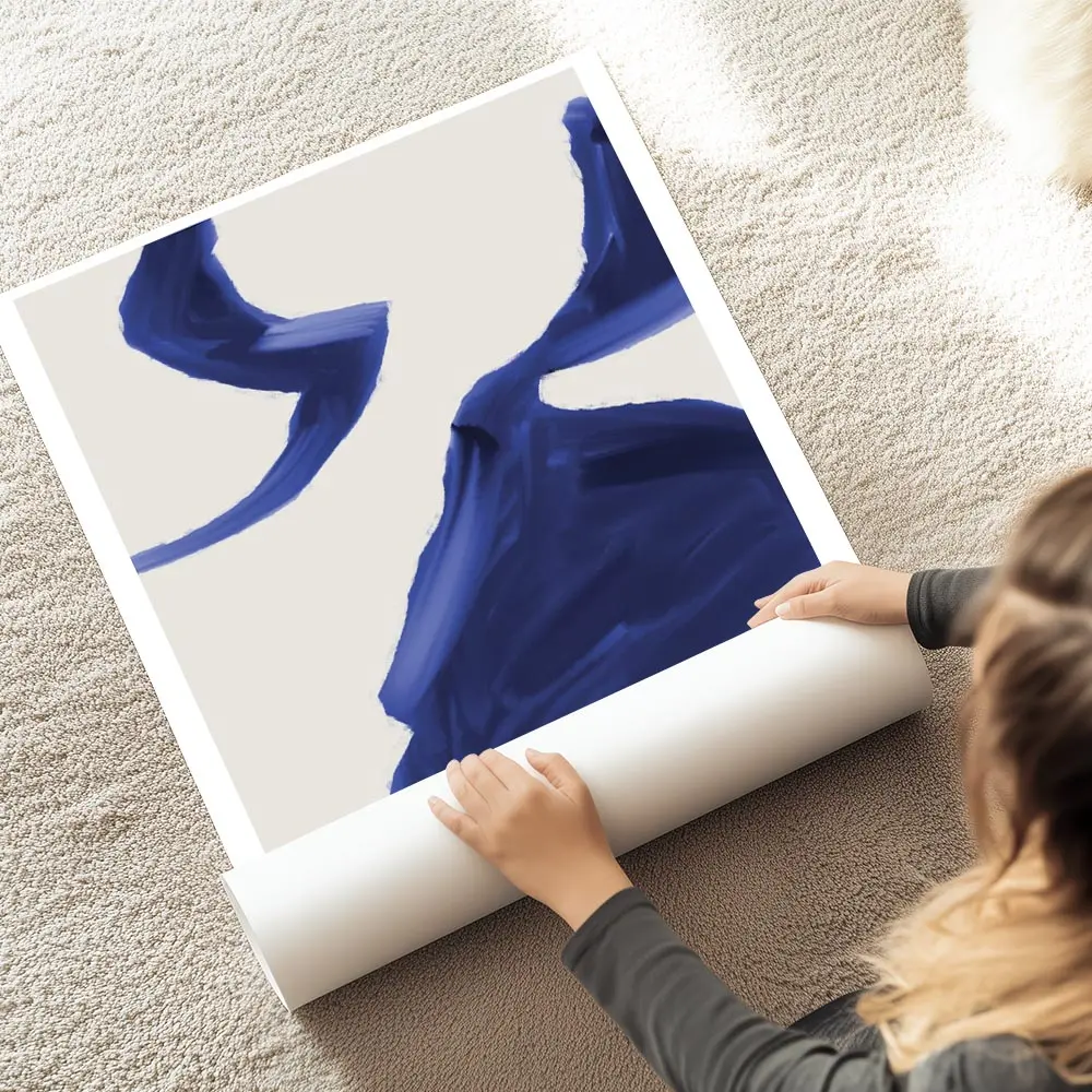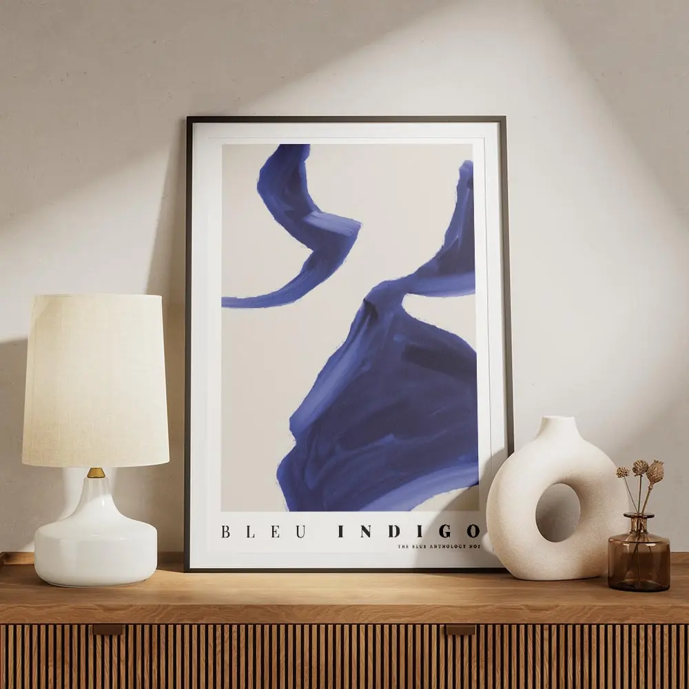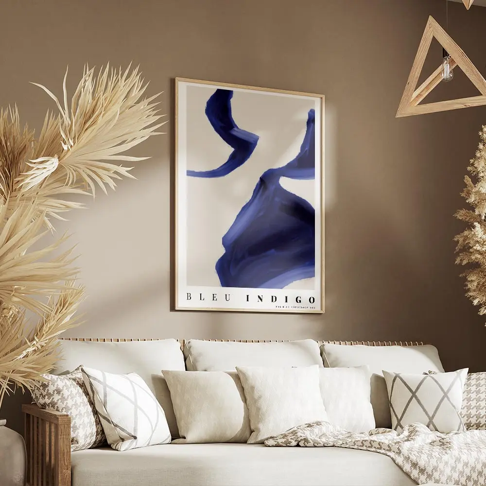 Ce Affiche Indigo abstrait formes bleues beige apporte une sensation calme et très graphique. On voit un fond beige doux, des formes bleues aux tons indigo et des plages plus claires qui se superposent. Les contours restent arrondis, l'ensemble respire, doucement, simple et vivant.