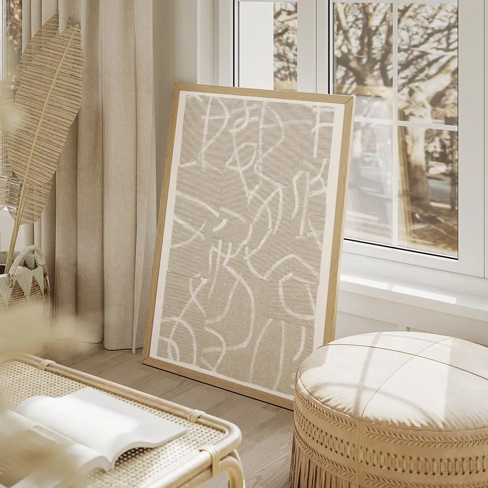 On pose les yeux et on ressent tout de suite une ambiance calme et soignée. Ce poster Affiche lignes abstraites blanches fond textile beige apporte un équilibre discret grâce à son fond beige à texture textile, ses lignes blanches qui se faufilent, et ses espaces clairs qui laissent respirer le motif. Simple, mais vivant, et tout en nuances.