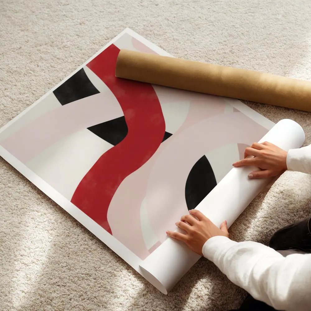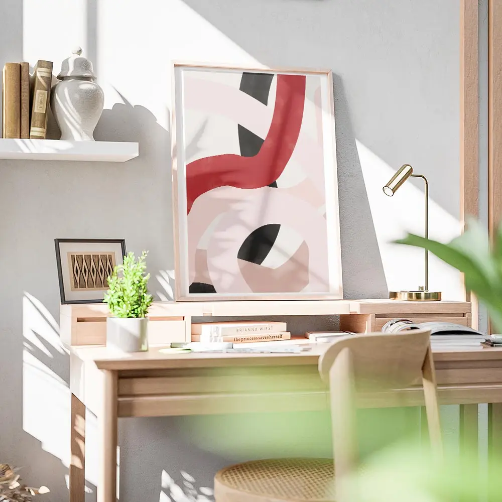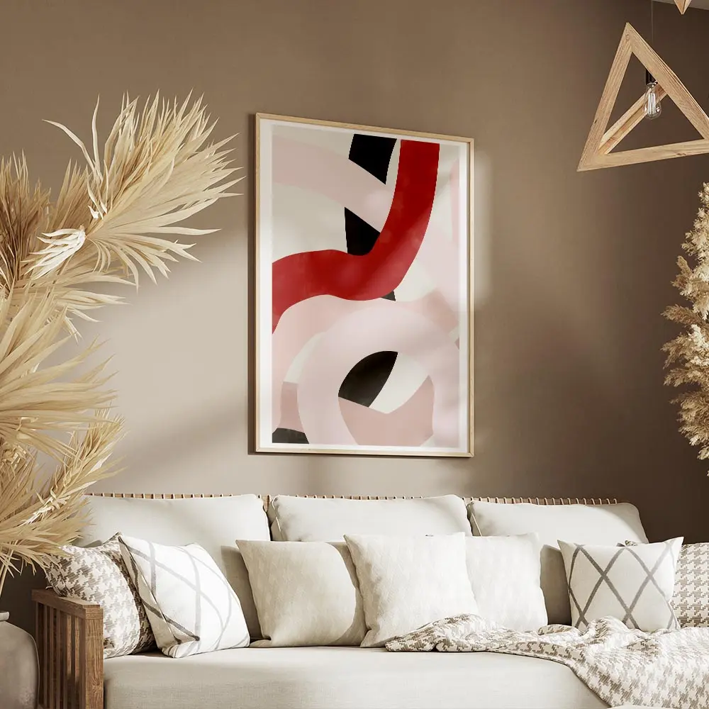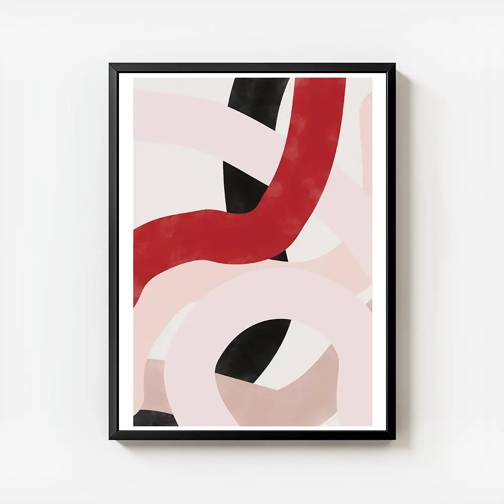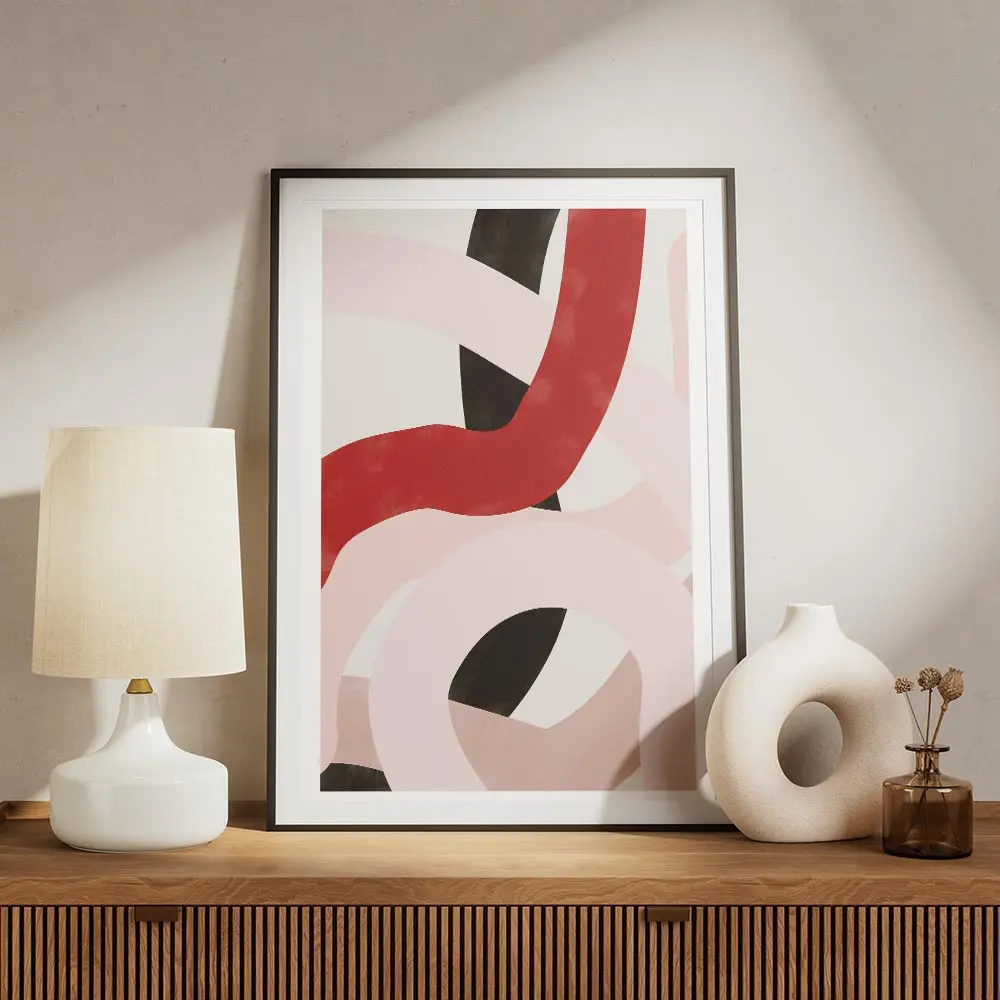 On l'imagine sur un mur clair pour que les couleurs respirent, avec des cadres fins noirs pour renforcer le côté graphique. Il fonctionne bien avec un mobilier minimaliste, des coussins rouges ou rosés, ou des objets métalliques noirs. Parfait au-dessus d'un canapé ou dans une entrée, il capte le regard. Pour prolonger le style, on peut regarder nos collections d'art abstrait ou de graphisme.