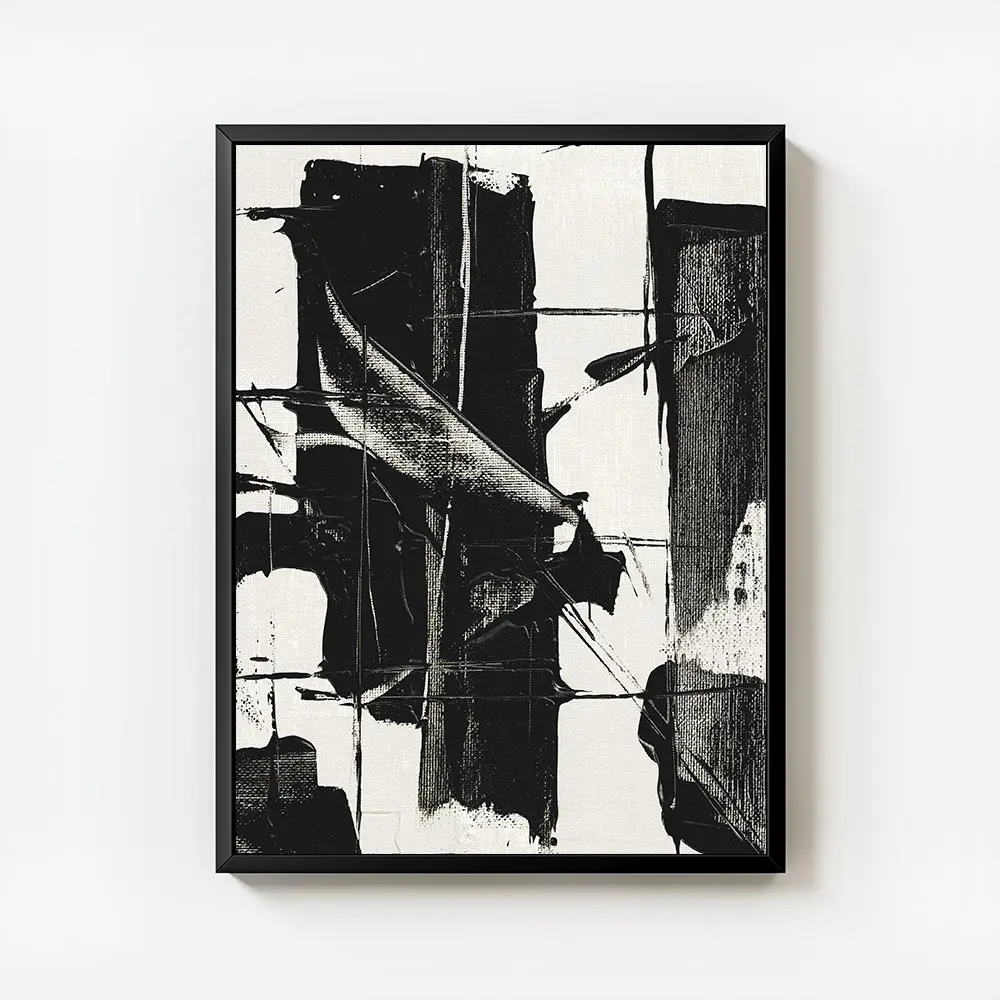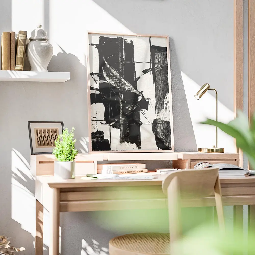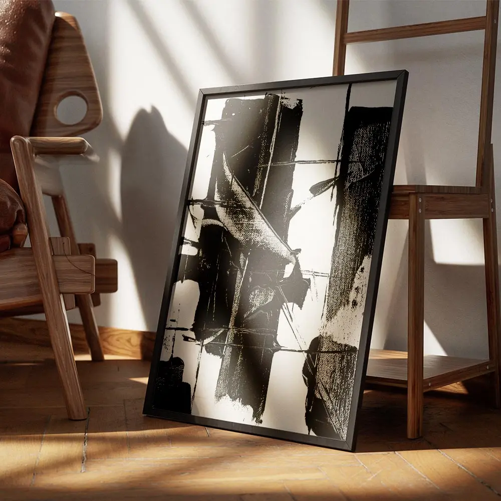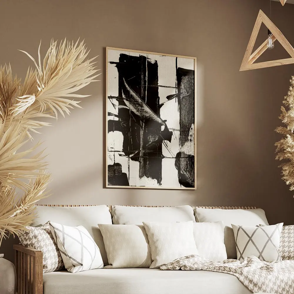 Sur un mur clair, ce poster fonctionne comme point focal. On l’associe à des cadres fins noirs, des meubles bois clair, et des textiles beiges pour équilibrer. Pour d’autres idées, découvrez nos pages poster noir et blanc ou art abstrait.