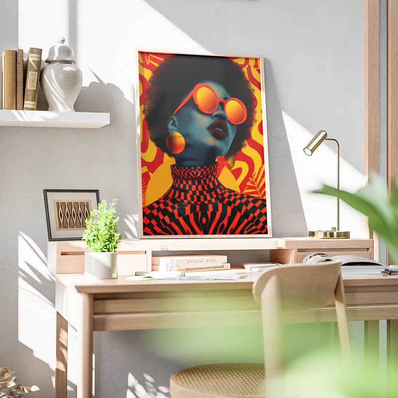 On est totalement fan du Poster art abstrait rétro. En le regardant, on ressent une vraie atmosphère chaleureuse qui nous transporte dans un autre temps. Ce mélange de couleurs douces et de formes graphiques crée une ambiance apaisante, presque hypnotique. On dirait qu'il nous invite à rêver, à laisser libre cours à notre imagination.