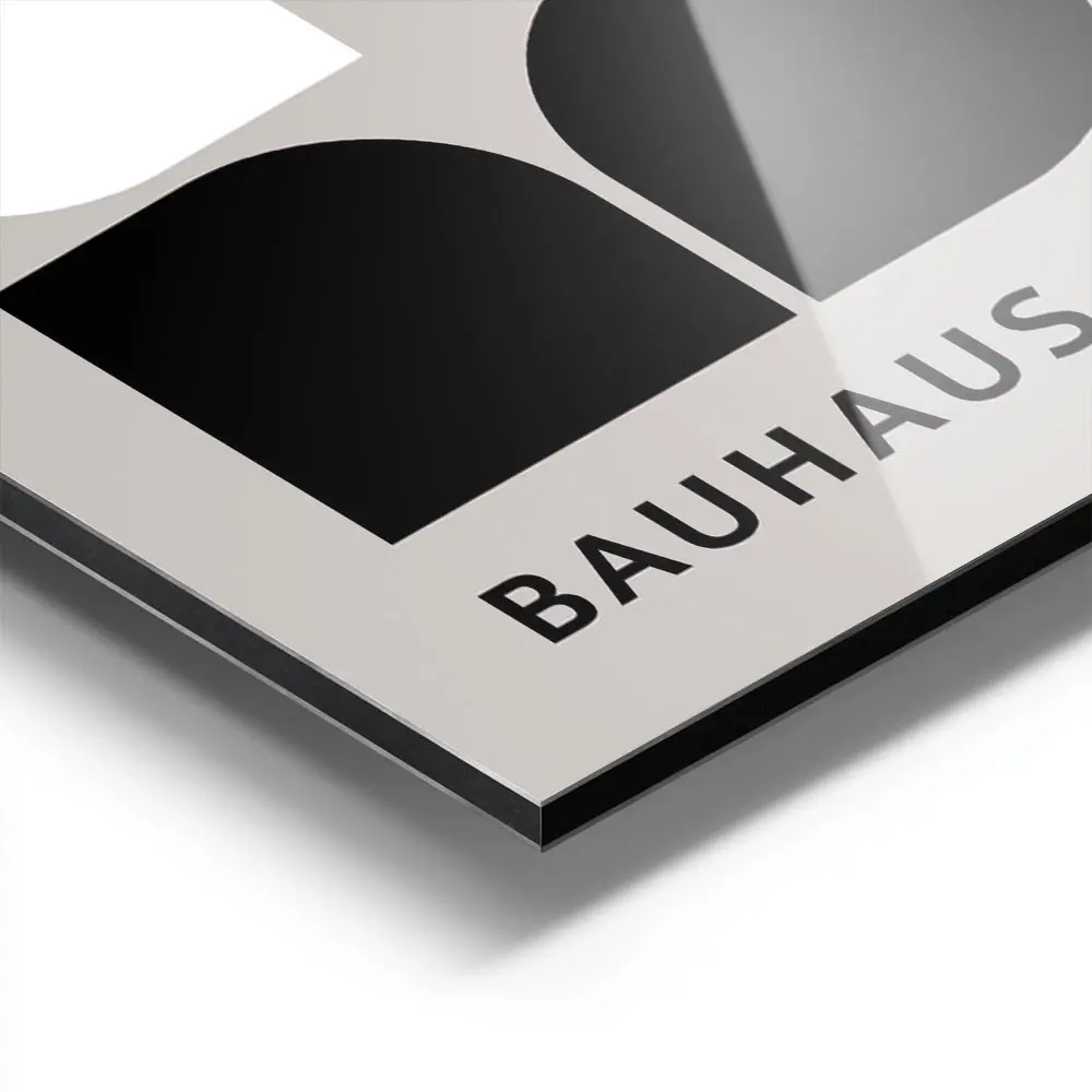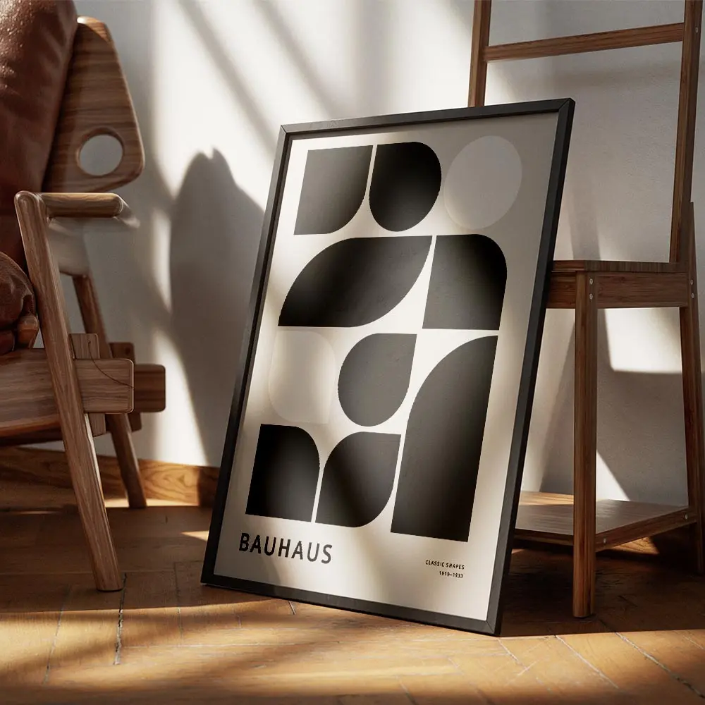 Ce Affiche Bauhaus formes géométriques noir blanc impose une présence simple et nette. On voit un fond gris clair et des formes géométriques en noir et blanc, agencées avec rigueur. Des cercles pleins, des rectangles, et des lignes noires traversent la composition. Le contraste joue fort, clair contre sombre, vide contre masse.