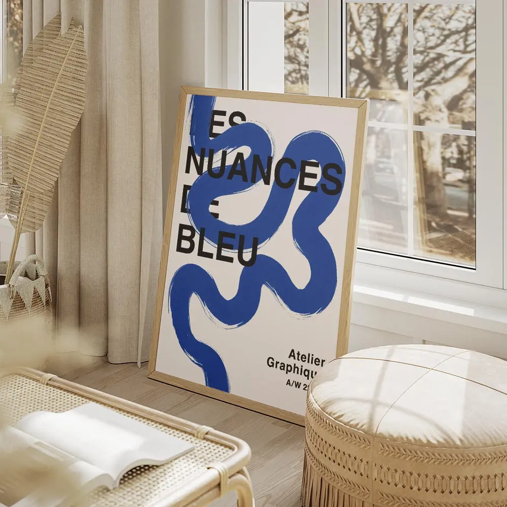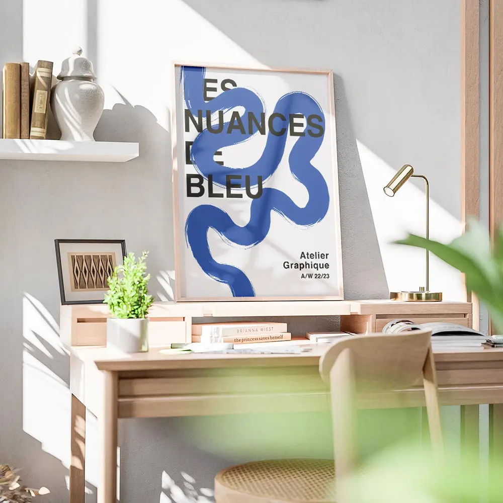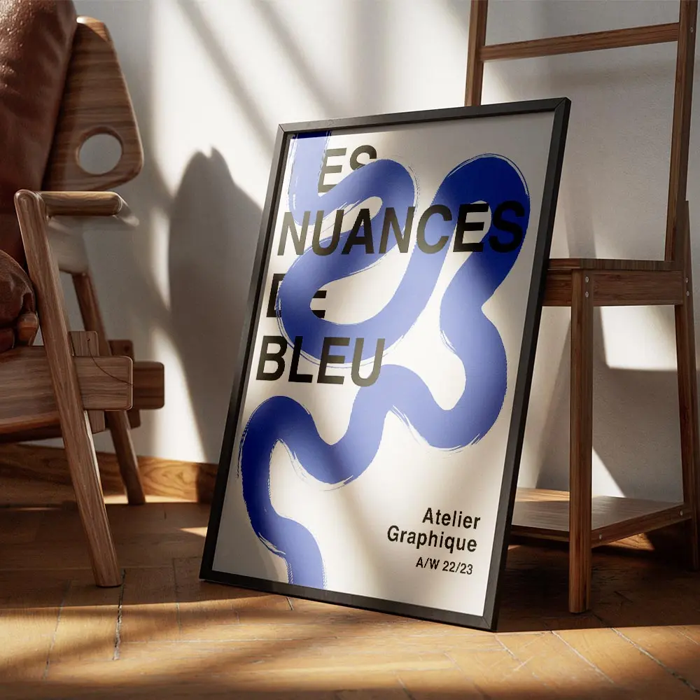 Cette Affiche ligne bleue sinueuse texte moderne frappe par sa simplicité. Fond blanc très clair, une ligne bleue sinueuse, fine et continue qui capte le regard, et du texte noir sobre, lisible et net. Atmosphère minimaliste, calme, presque graphique. Les marges restent larges, on respire en regardant l’ensemble. L’impression paraît nette et actuelle.