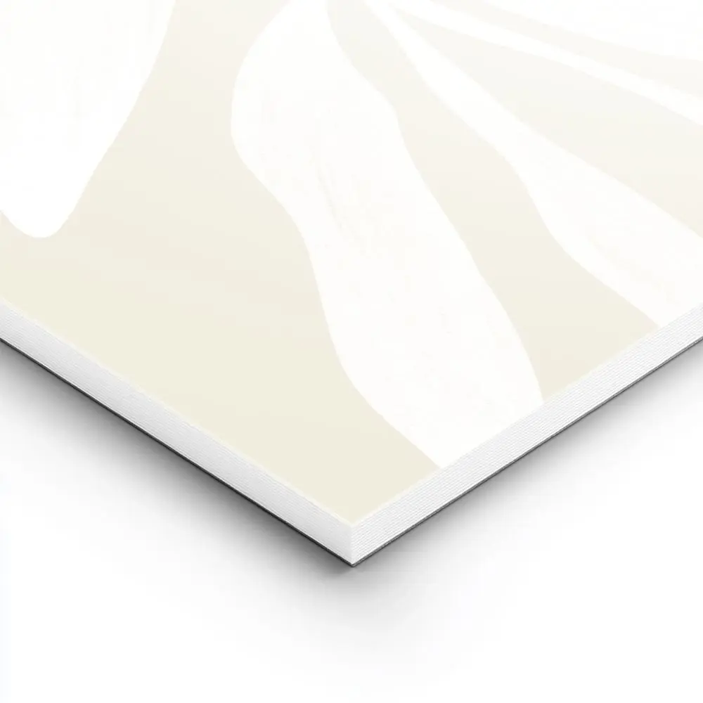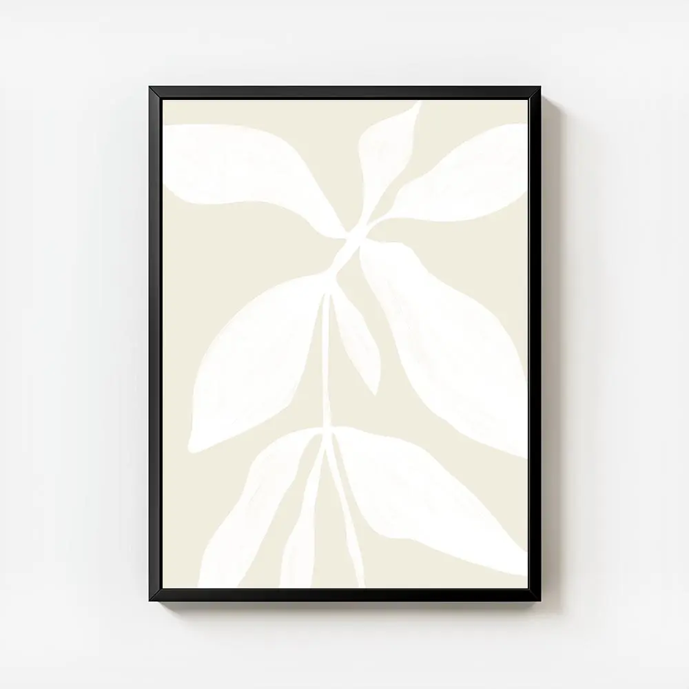 Sur un mur clair, le beige fond permet au blanc de ressortir; sur un mur sable ou gris chaud, l'ensemble devient plus enveloppant. Associer avec un cadre en bois clair pour une ambiance scandinave, ou un cadre fin noir pour un contraste plus marqué. Fonctionne bien dans un salon, une chambre ou un bureau. Pour compléter, voir nos posters plantes vertes ou la sélection art minimaliste.