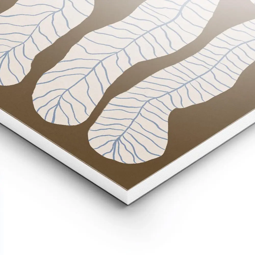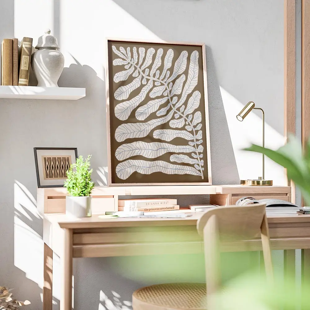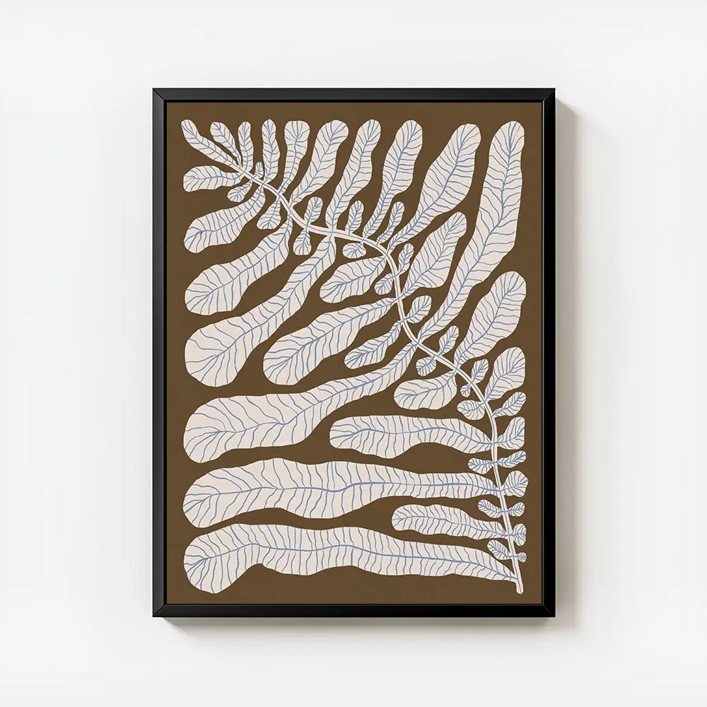 Ce Affiche plante feuilles légères brunes montre une plante aux feuilles légères sur un fond brun. On voit des branches fines qui serpentent, des feuilles aériennes et un contraste doux entre le motif végétal et le fond. L’ensemble dégage calme et simplicité, visuel très épuré, presque minimal. On apprécie la finesse du tracé.