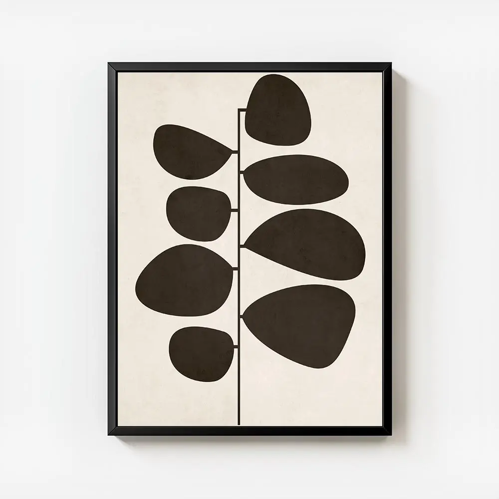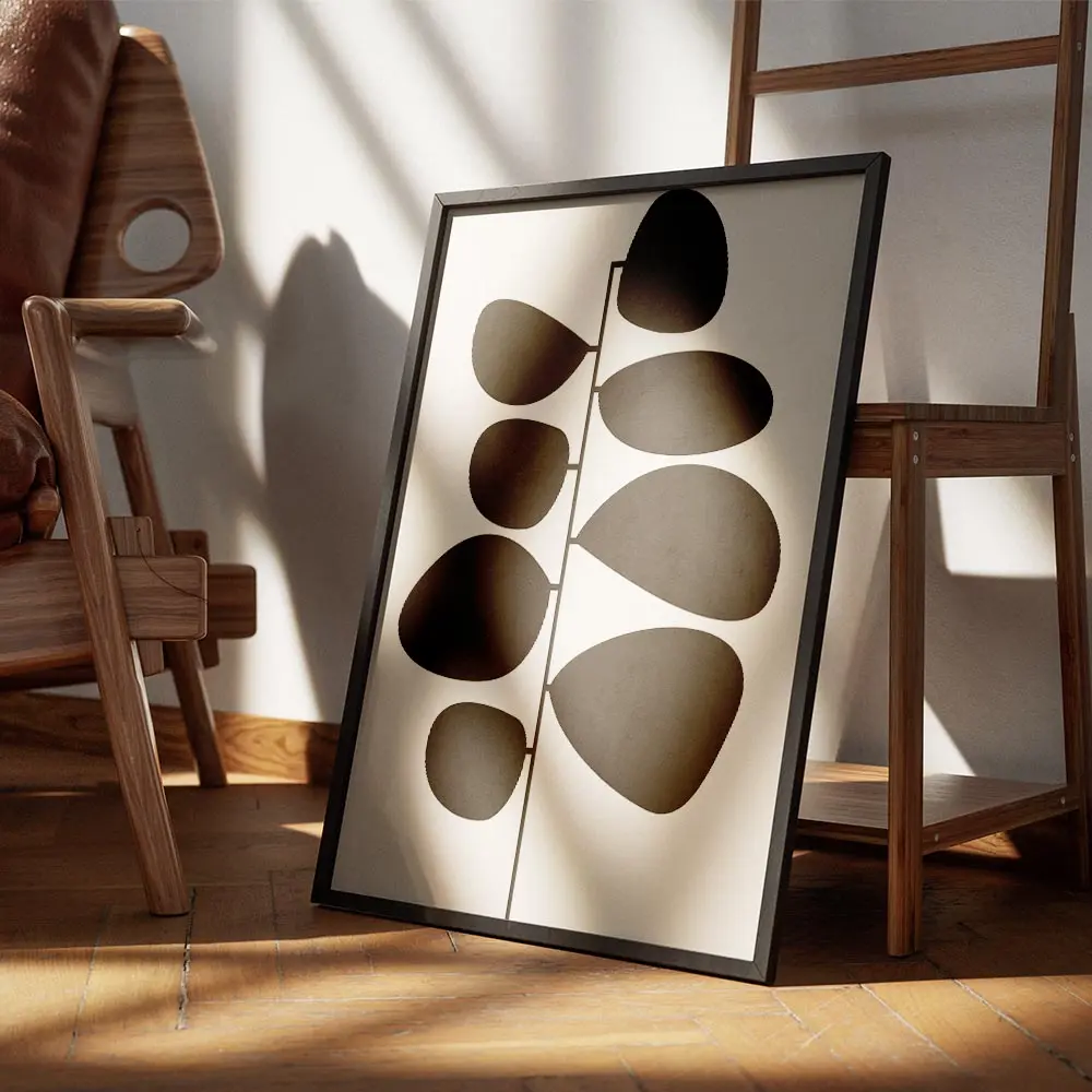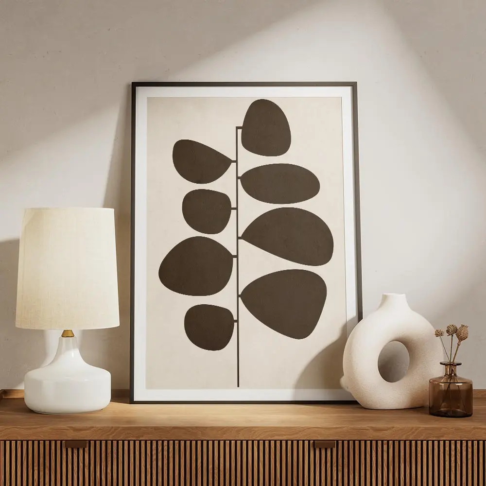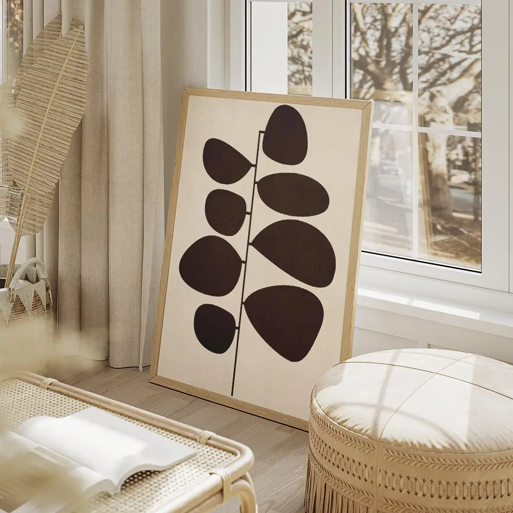 Sur un mur blanc ou crème, les tons beige et marron ressortent bien. Avec du mobilier en bois clair ou cannelle, l’ensemble devient chaleureux. Ajouter une plante verte à côté apporte du relief, et un cadre bois ou noir mat finit très bien la composition.