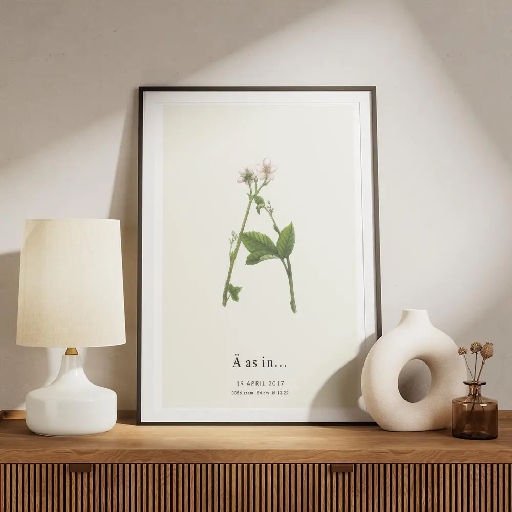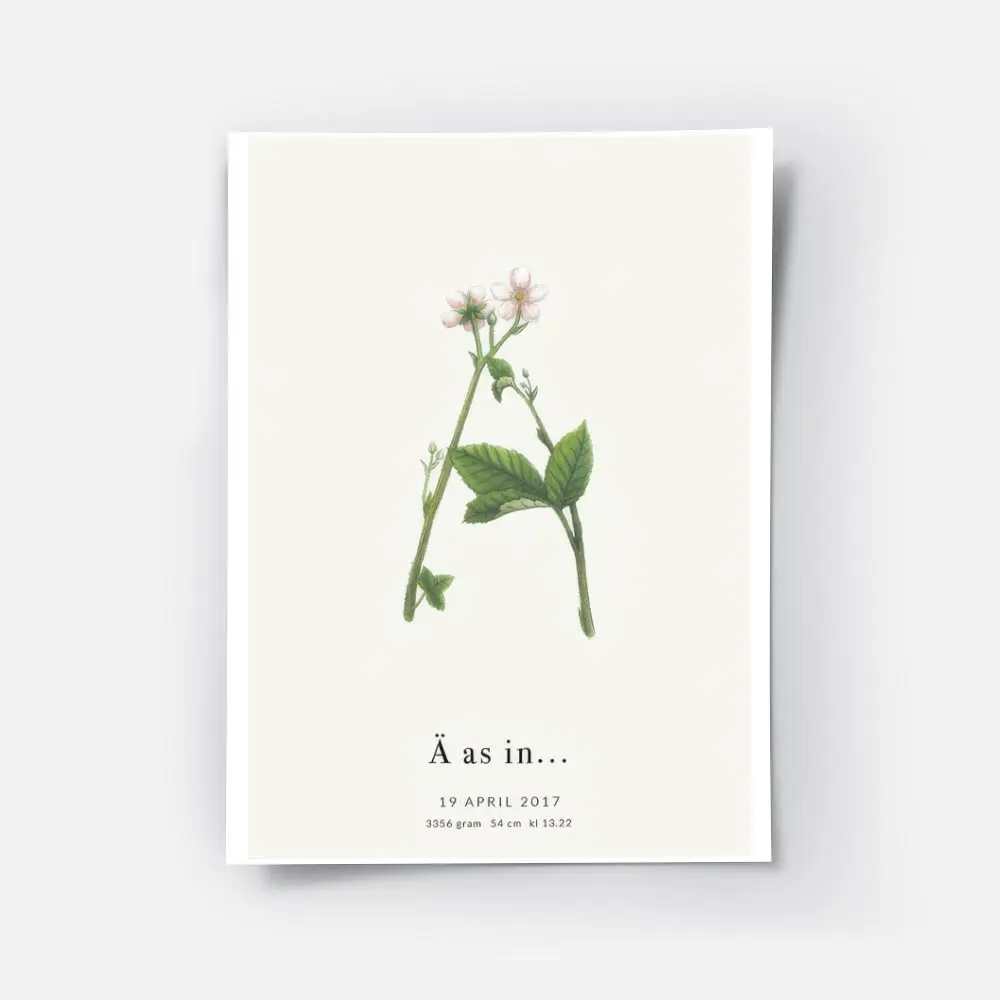 Cette Affiche lettre A botanique montre une grande lettre A au centre. Les fleurs et les feuillages dessinent la forme de la lettre. On remarque des pétales serrés, des petites feuilles fines et des tiges qui s’entrelacent autour du tracé. Un texte discret se trouve sous la lettre, aligné et sobre. Le fond reste clair, avec beaucoup d’espace vide, ce qui donne une impression légère, presque aérienne.