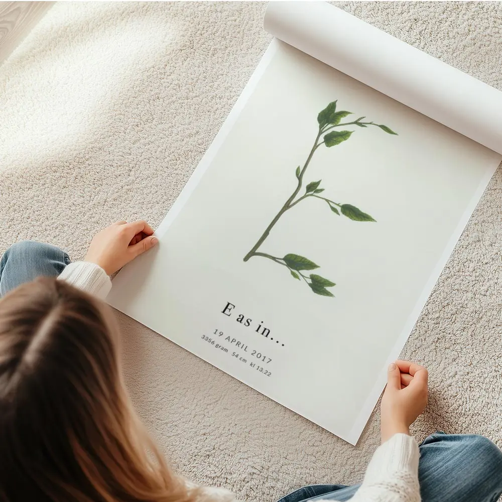 Cette Affiche lettre E botanique montre un grand E formé par des branches fines et des feuilles vertes. Le fond reste blanc, très aérien. On voit des feuilles ovales, des tiges entrelacées et des nuances de vert qui donnent du relief. C’est simple, net, apaisant.