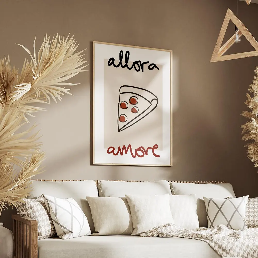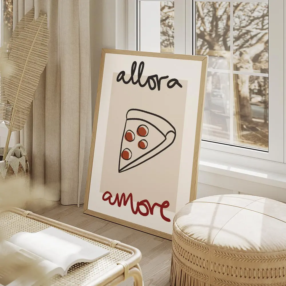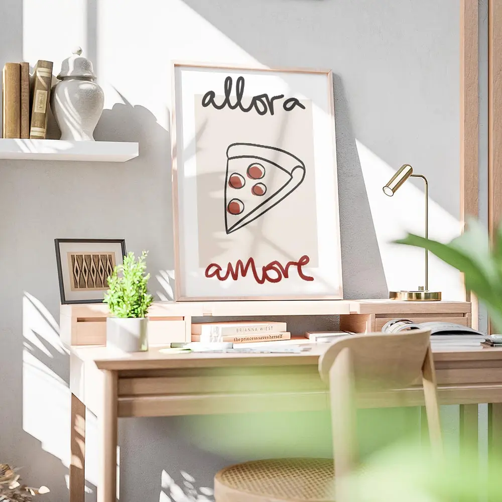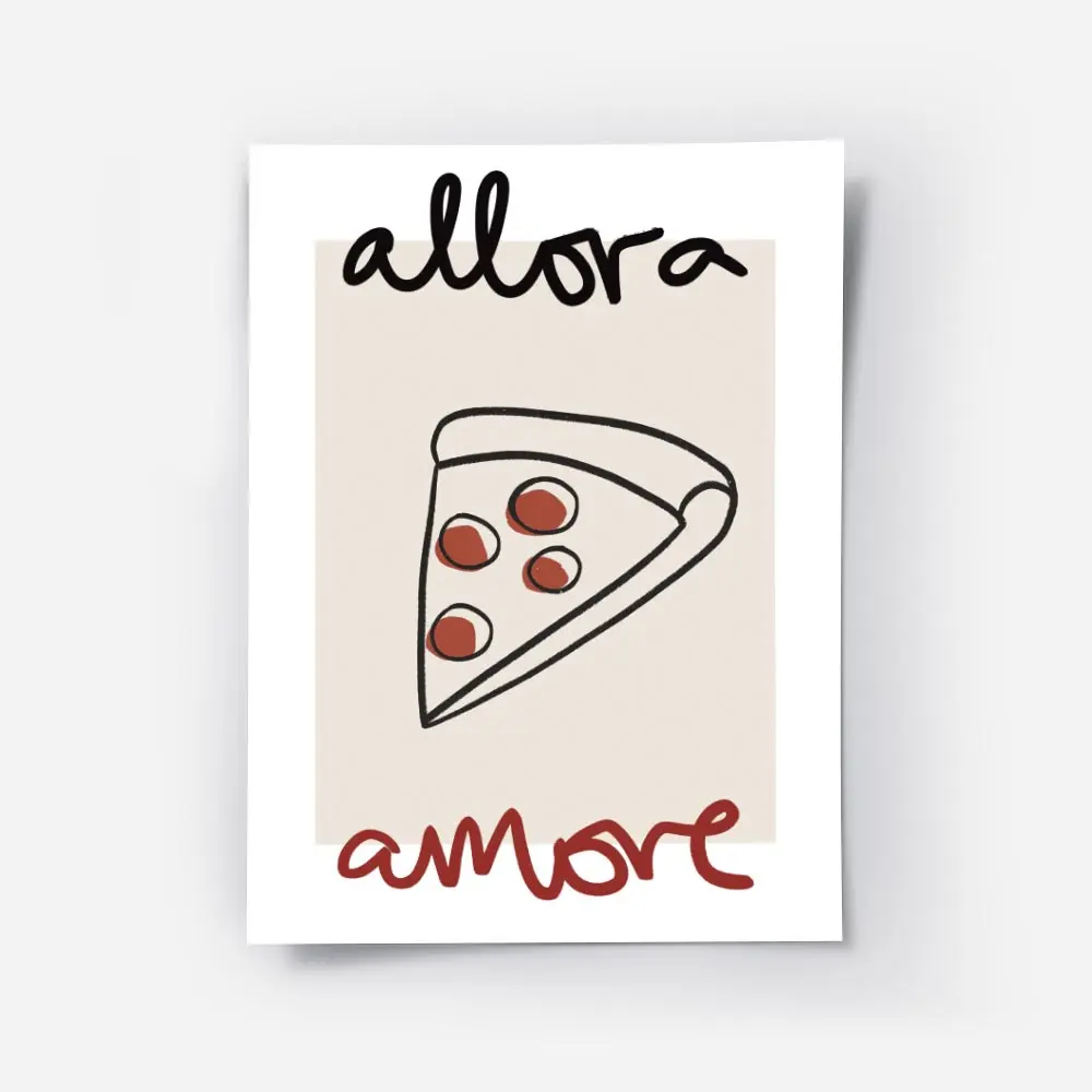 Cette affiche, Affiche Allora Amore part de pizza, montre une part de pizza stylisée sur un fond blanc. La tranche garde une forme triangulaire nette, avec une croûte beige et une garniture aux tons jaunes et orangés. Un texte en noir et rouge encadre le visuel, bien lisible et posé près de la tranche. L’ensemble reste minimal, clair, direct. On sent le contraste entre le blanc du fond, le noir du texte et les touches chaudes de la pizza.