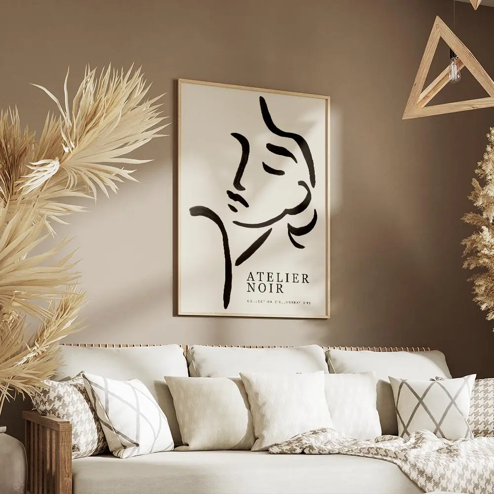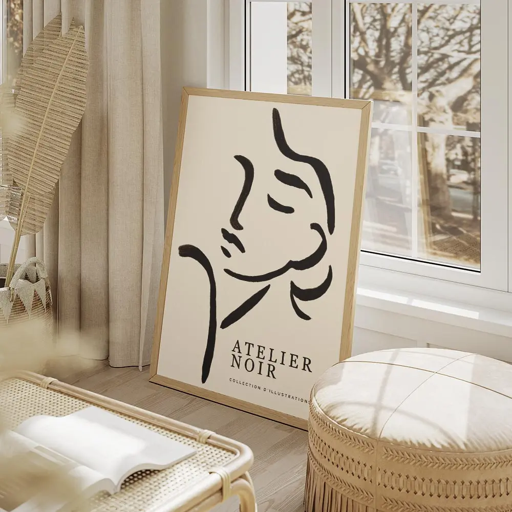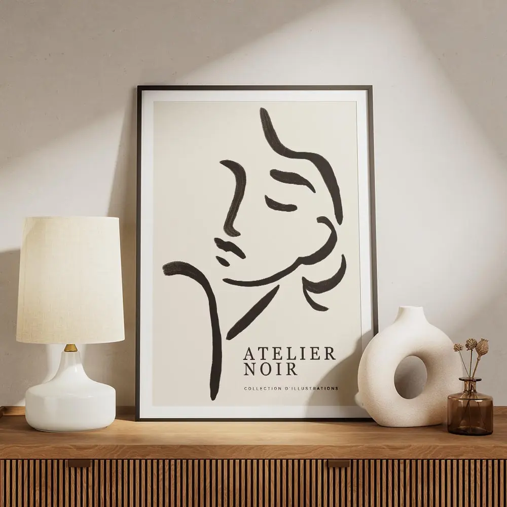 Cette Affiche line art visage féminin abstrait capte tout de suite par sa simplicité. On voit un visage stylisé tracé au trait noir, posé sur un fond clair presque blanc. Les lignes restent fines, continues pour le contour du visage, les courbes du nez et la bouche. L'ensemble garde un équilibre léger, très graphique, très calme.